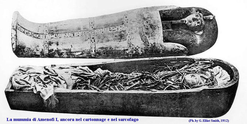 La mummia di Amenhotep I, rinvenuta nel 1881, si trovava nella cachette di Deir el-Bahari (DB320) dove, sotto il regno di Sheshonq I, i sacerdoti di Amon la fecero trasportare, con molte altre, per preservarle dai saccheggiatori ormai così numerosi nella Valle dei Re. La mummia si trova in ottimo stato di conservazione, le bende che la avvolgono sono ricoperte da uno strato di cartonnage di squisita fattura e valore artistico, è l’unica a non essere mai stata sbendata, era ancora così ben conservata che non la toccarono neppure i sacerdoti quando, durante la XXI dinastia, dopo averle portate nella cachette di Deir el-Bahari, restaurarono i bendaggi delle altre antiche mummie reali.