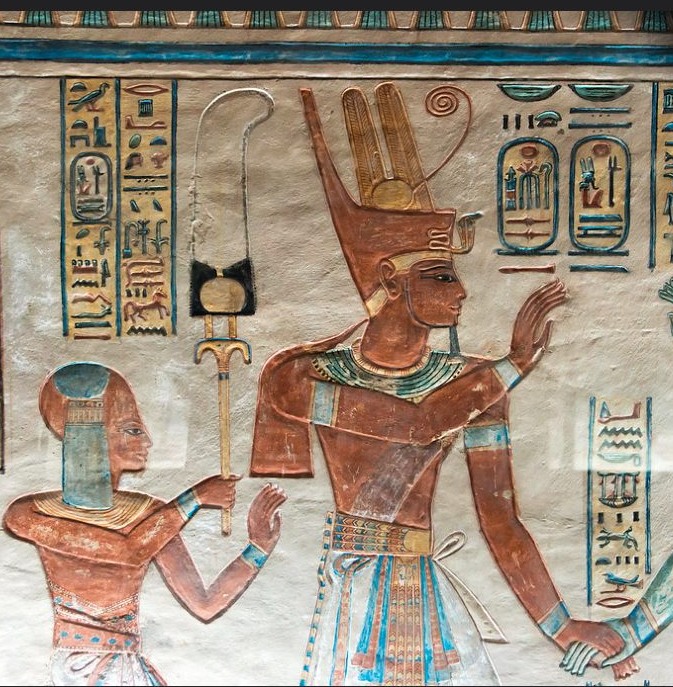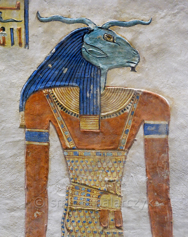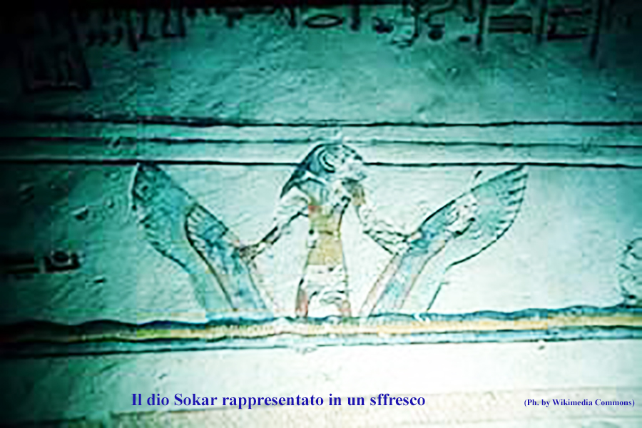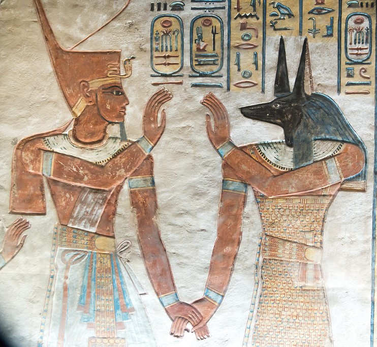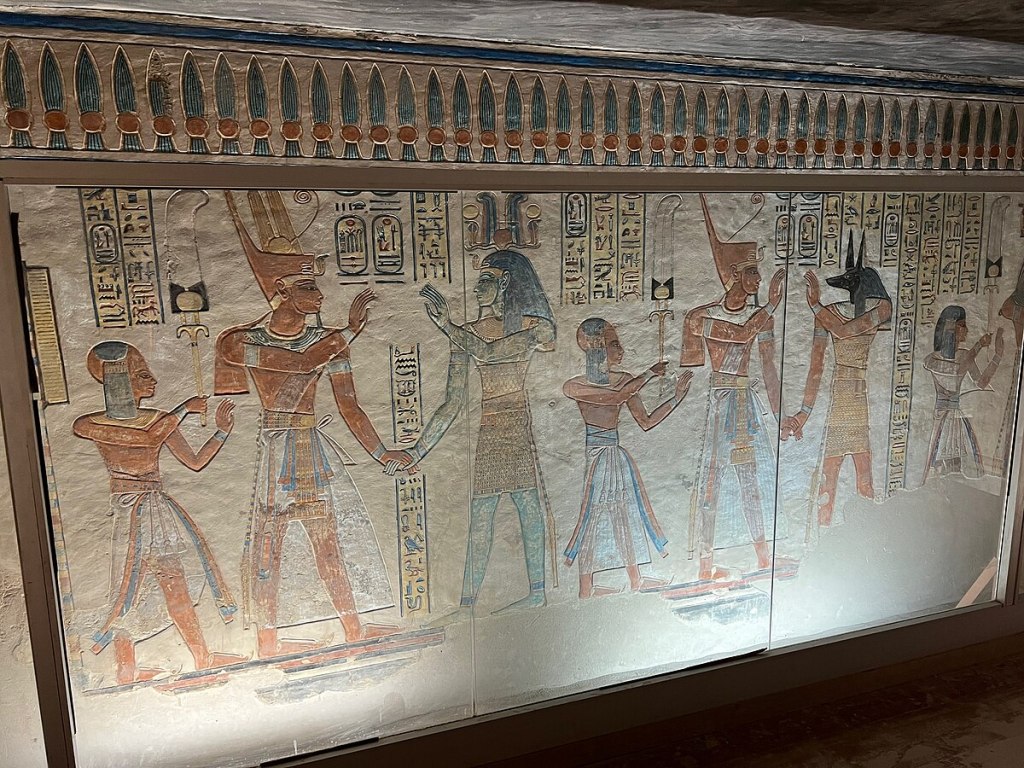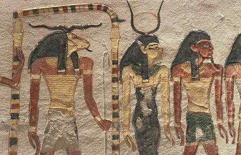 Le anime di Pe (con la testa di falco) e di Nekhen (con la testa di canide) che figurano sulla parete destra della camera sepolcrale, raffigurate mentre compiono il tipico gesto con il quale salutavano il sovrano defunto nei riti di purificazione davanti agli dei.