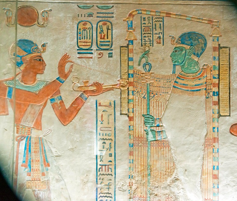 La regina nelle vesti di un sacerdote Iunmutef mentre effettua un’offerta di incenso. https://commons.m.wikimedia.org/…/File:QV52_Tomb_of…