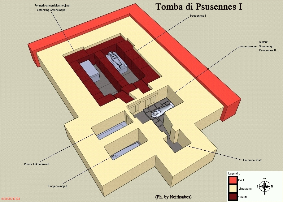 Un graffito in ieratico scoperto nel tempio di Ptah ad Abydos identifica Pasebakhaenniut come Re dell’Alto e Basso Egitto, Alto sacerdote di Amon-Ra (non Primo Profeta) e capo dell’esercito. Ovviamente la controversia se Psusennes II e Psusennes III siano la stessa persona rimane ancora aperta. Non si sa dove Psusennes II abbia fatto costruire la sua tomba e dove sia realmente sepolto anche se il ritrovamento di un sarcofago contenente una mummia nell’anticamera della tomba tinita di Psusennes I farebbe pensare che gli appartenga.