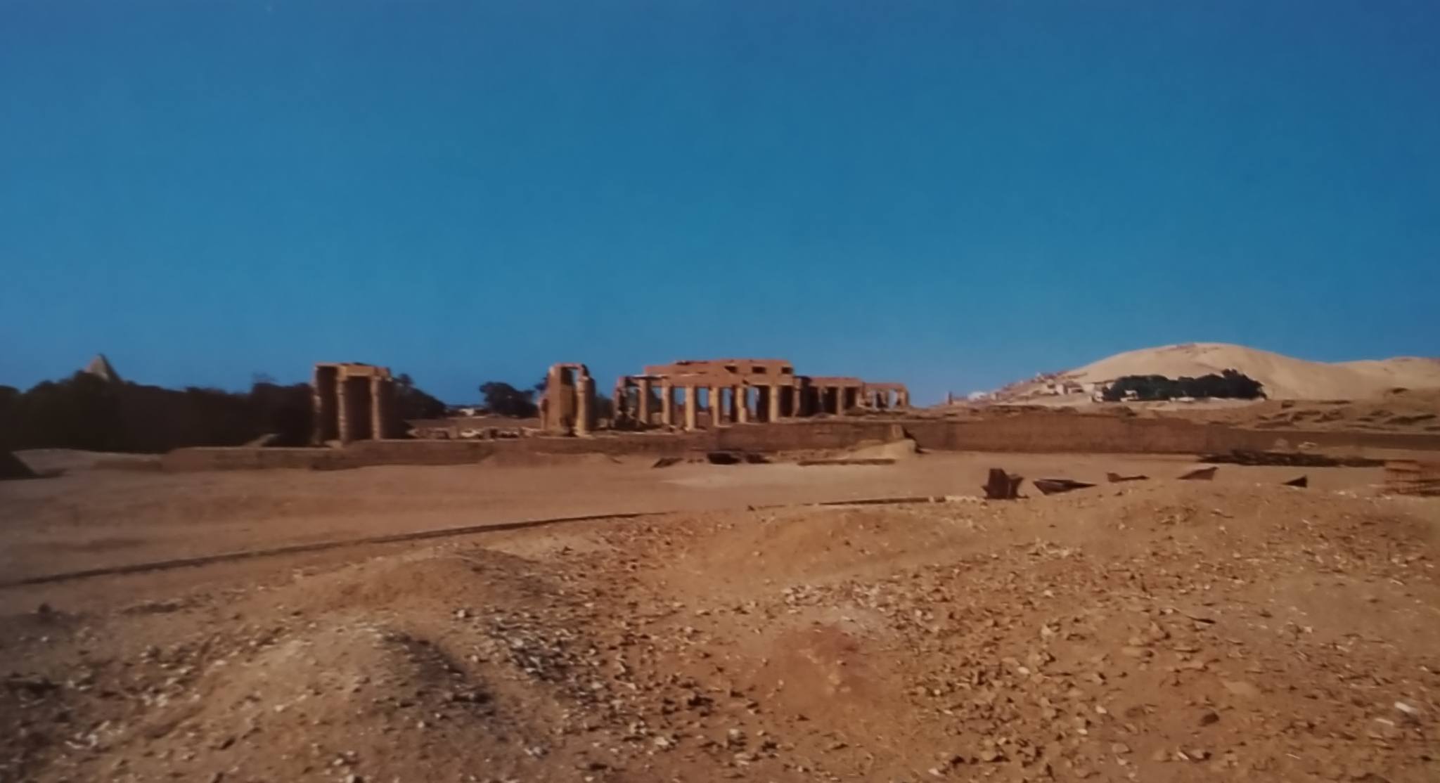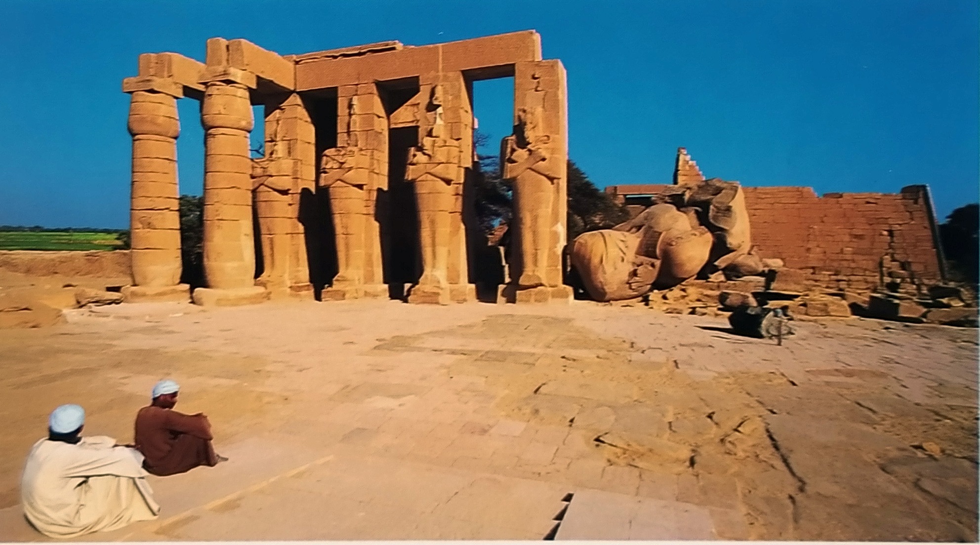 A sinistra dell’enorme busto giacente si ergono quattro pilastri osiriaci, resti del porticato che correva attorno al secondo cortile e, alle spalle, si ravvisano le scarse vestigia del secondo pilone. Ben visibili sullo sfondo a destra sono invece i ruderi del primo pilone con i bassorilievi che celebrano Ramses II mentre ferma gli Hittiti nella battaglia di Kadesh. In primo piano, giacciono i frantumi delle due imponenti statue del faraone che erano poste di guardia alla grande sala ipostila; la magnifica testa di una di esse,con parte del busto, soprannominata il “Giovane Memnone”, fu recuperata da Giovanni Battista Belzoni e trasportata al British Museum (Immagine n. 5).