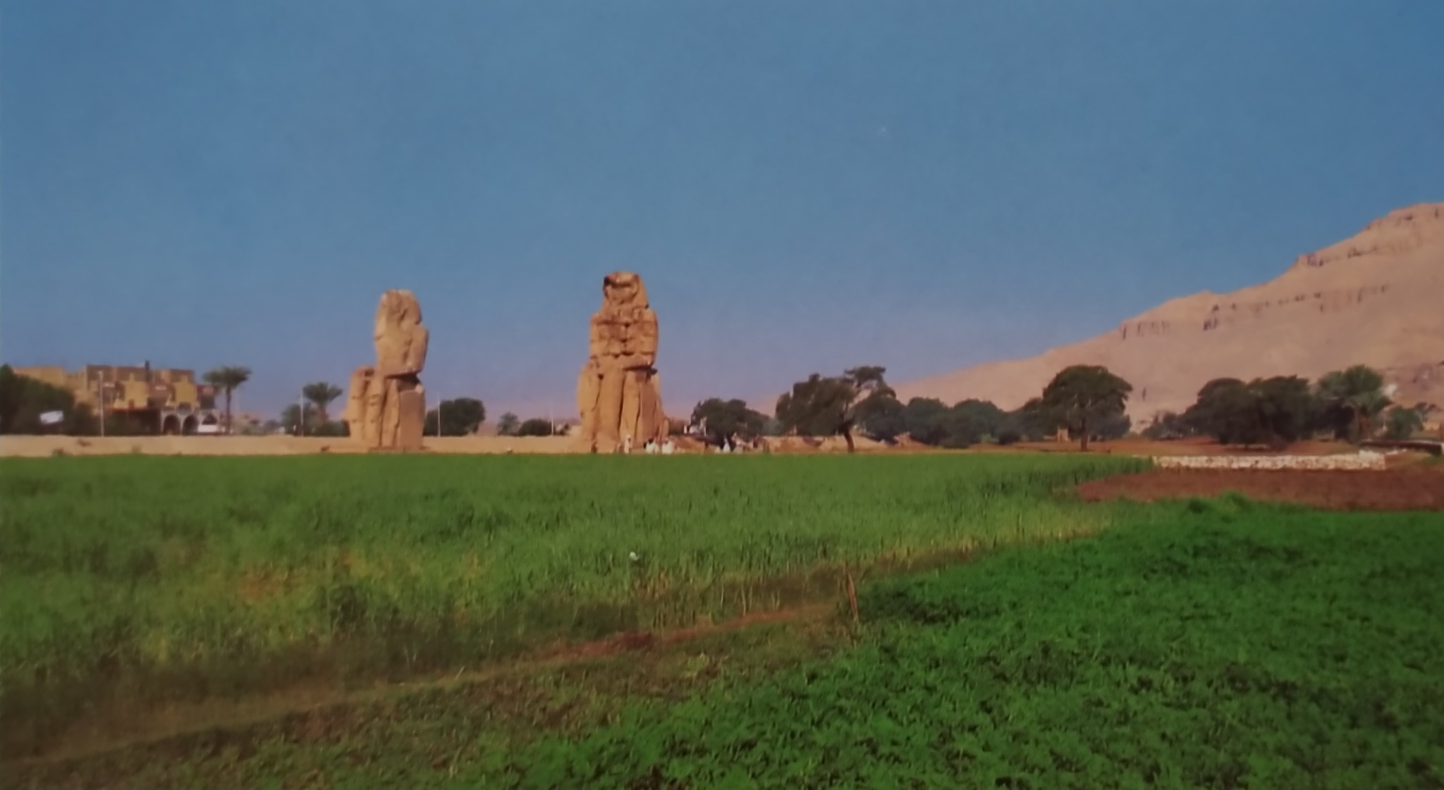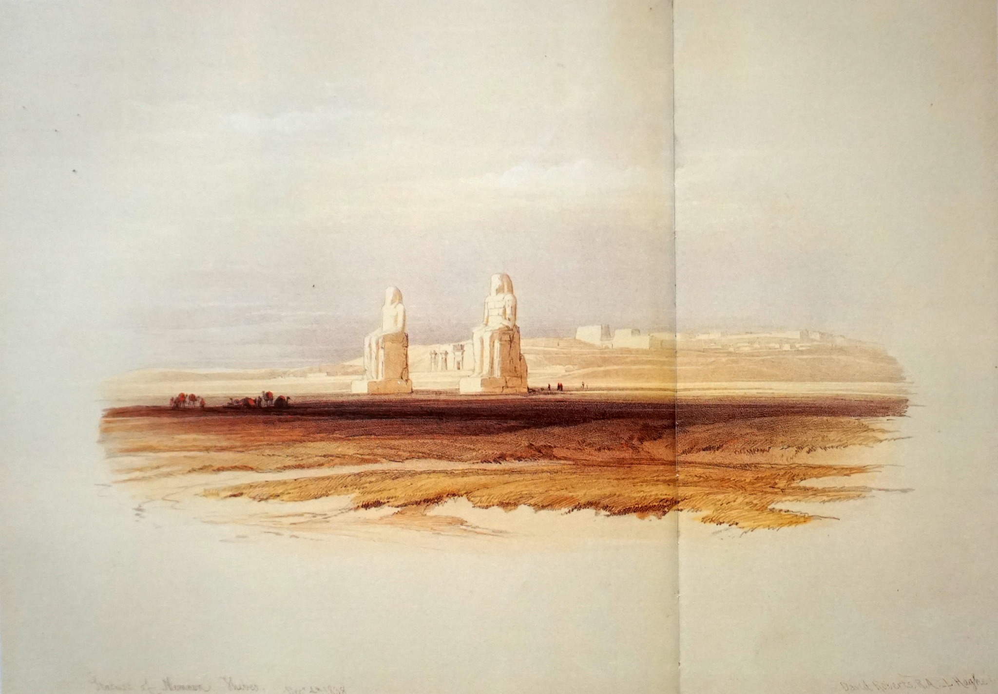 L’intera giornata del 4 dicembre vide Roberts impegnato a ritrarre, da tre diverse angolazioni, i colossi di Memnone. Queste monumentali statue gemelle, già celebrate nell’antichità, sono tutto ciò che rimane del tempio funerario di Amenhotep III, progettato dall’architetto Amenhotep, figlio di Hapu. L’edificio, il maggiore di Tebe Ovest, fu costruito essenzialmente con mattoni crudi che, a causa della vicinanza col Nilo, subirono l’azione delle sue esondazioni; ridotto praticamente in rovina, fu successivamente utilizzato come cava di materiali da costruzione. Analoga sorte toccò alla magnifica reggia del sovrano che sorgeva a Malqatta, pochi chilometri a nord-est del tempio. Questo grandioso palazzo reale, circondato da una possente cinta muraria al cui interno erano presenti anche magazzini per lo stoccaggio e la conservazione di derrate alimentari, era fronteggiato da un enorme bacino artificiale, il Birket Abu, collegato al fiume per mezzo di un canale navigabile.