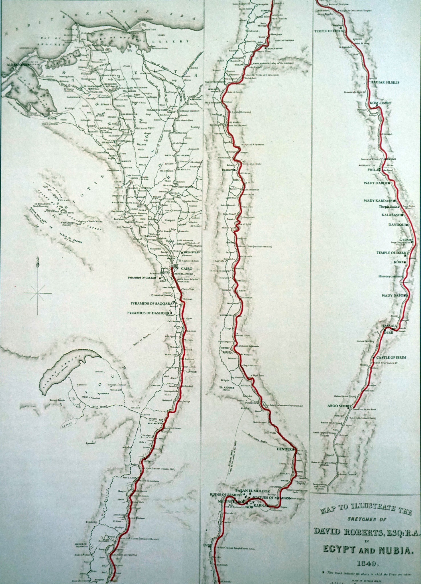 Roberts aveva pianificato accuratamente il suo viaggio allo scopo di ridurre le soste, e di conseguenza le spese, all’essenziale. Si era prefissato di raggiungere Abu Simbel nel più breve tempo possibile per poi risalire il Nilo sino al Cairo. Le Immagini n. 1 e n. 2 ci illustrano al meglio come si articolò la sua permanenza in Egitto.