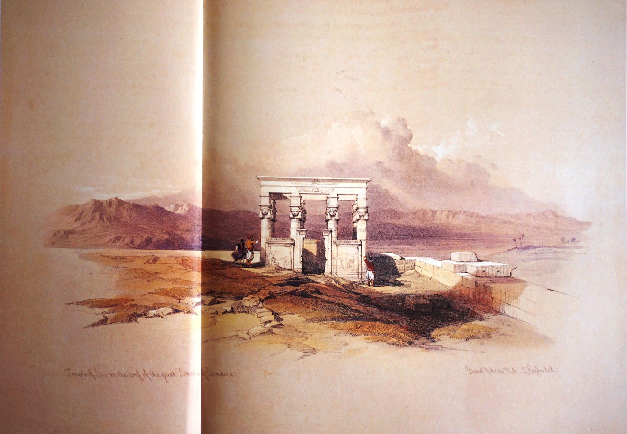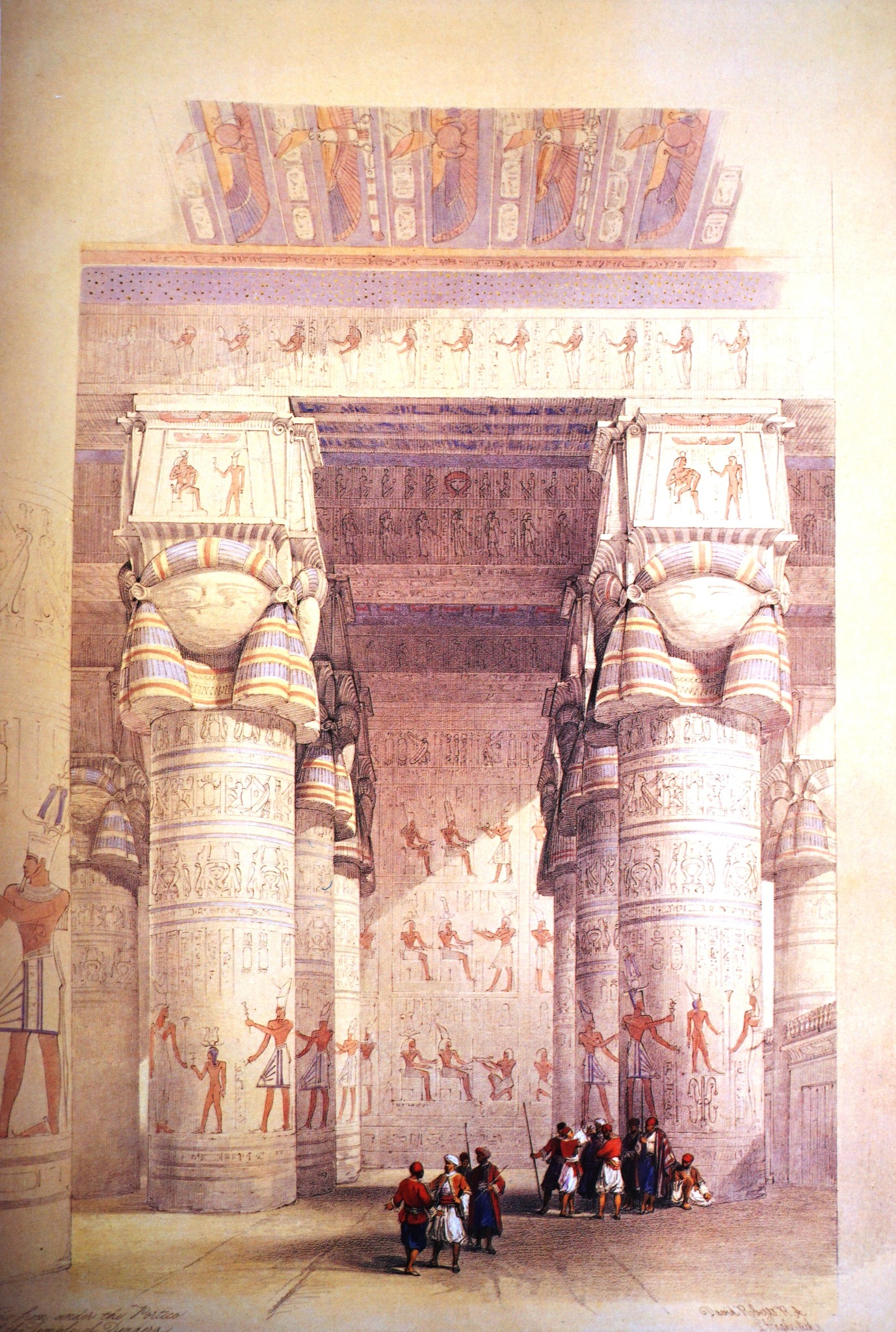 Roberts ritrasse quello volto ad est, il meglio conservato dei due e, come appare evidente nella litografia, all’epoca della sua visita era in gran parte interrato, così come lo erano il tempio di Hathor e gli altri edifici che lo circondano.