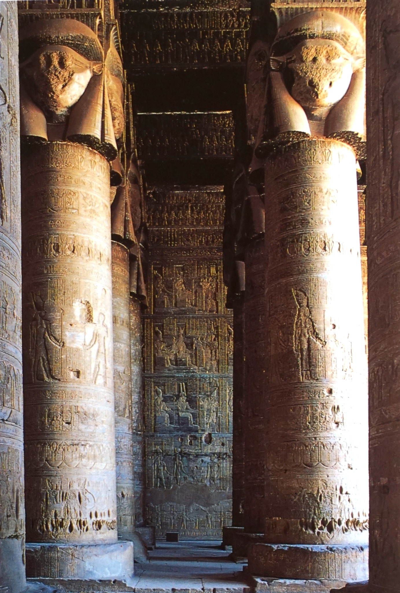 Il tempio di Hathor, diversamente dalla tipica tradizione egizia, non presenta alcun pilone, elemento solitamente onnipresente nell’architettura sacra; lo sviluppo frontale dell’edificio è risolto con una possente struttura, larga 42 metri ed alta 18. Sei colonne, presenti lungo la facciata, sorreggono un’imponente cornice, mentre gli spazi intercolumnari sono riempiti fino a mezz’altezza da pannelli ricoperti di testi geroglifici e bassorilievi. Al centro, formando un alto spazio vuoto, si apre l’ingresso che permette l’accesso all’interno del tempio dove, su tre file, sono disposte altre diciotto colonne i cui capitelli riproducevano un tempo il volto sorridente della dea Hathor. Elevandosi oltre l’altezza del resto del tempio, questa sala ipostila, aggiunta sotto l’imperatore romano Tiberio, in un certo qual modo svolge la funzione del pilone mancante. L’insieme, con la sua sagoma marcatamente trapezoidale e le massicce colonne, potrebbe far pensare ad un edificio grossolano e sgraziato: invece, il perfetto equilibrio tra pieni e vuoti e i raffinatissimi particolari della ricca decorazione, ci restituiscono un vero e proprio miracolo architettonico.