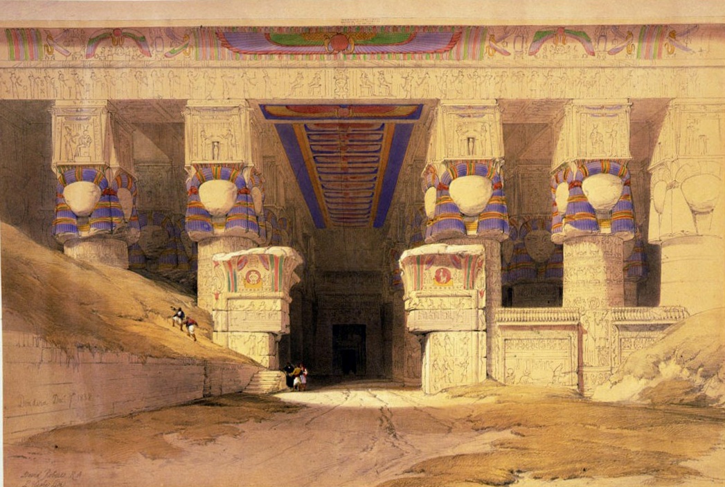Dendera (Iunet ta-neṯeret, in antico egizio, poi Tentyris in epoca ellenistica) fu uno dei centri religiosi più importanti dell’ Antico Egitto. La città, infatti, era sede di ben tre santuari consacrati rispettivamente ad Horus, Ihy e ad Hathor. Solo quest’ultimo ci è pervenuto quasi intatto, mentre degli altri due non restano che sparute tracce. Così come accadde a Roberts, i viaggiatori e gli archeologi che si spinsero nel cuore dell’Alto Egitto rimasero puntualmente incantati dal tempio dedicato alla dea dell’amore e del piacere; all’epoca era per una buona metà sepolto sotto la sabbia, tuttavia emanava già quel fascino che oggi, dopo le intense campagne di scavo e di restauro, si manifesta in tutto il suo splendore. Quando cominciò l’esplorazione sistematica del sito ci si rese conto che l’orientamento verso sud e la grande immagine di Hathor presente sul muro meridionale avevano un significato ben preciso. Infatti, sulla medesima sponda del fiume, ma molti chilometri a monte, a Edfu, sorge il tempio dedicato ad Horus. Le due località erano i maggiori centri di culto di queste due divinità per le quali a maggio di ogni anno si celebrava una grande festa durante la quale di simulacri di Horus e Hathor venivano portati in processione sul Nilo a bordo delle imbarcazioni sacre. Tracce di edifici emerse durante i lavori di scavo del sito, dimostrano che Dendera fu un importante centro cultuale già a partire almeno dall’Antico Regno con un complesso templare più volte distrutto e ricostruito. L’assetto attuale, risalente all’epoca tardo tolemaica e romana, è caratterizzato dal prevalere di un gusto più sfarzoso rispetto alla maestosa ieraticità dei templi egizi più antichi. Questa caratteristica è ben evidente nella prima litografia realizzata da Roberts, che ritrae l’interno della prima sala ipostila, un grandioso ambiente profondo circa venticinque metri sostenuto da diciotto gigantesche colonne ricoperte di bassorilievi (Immagini n. 2-3)