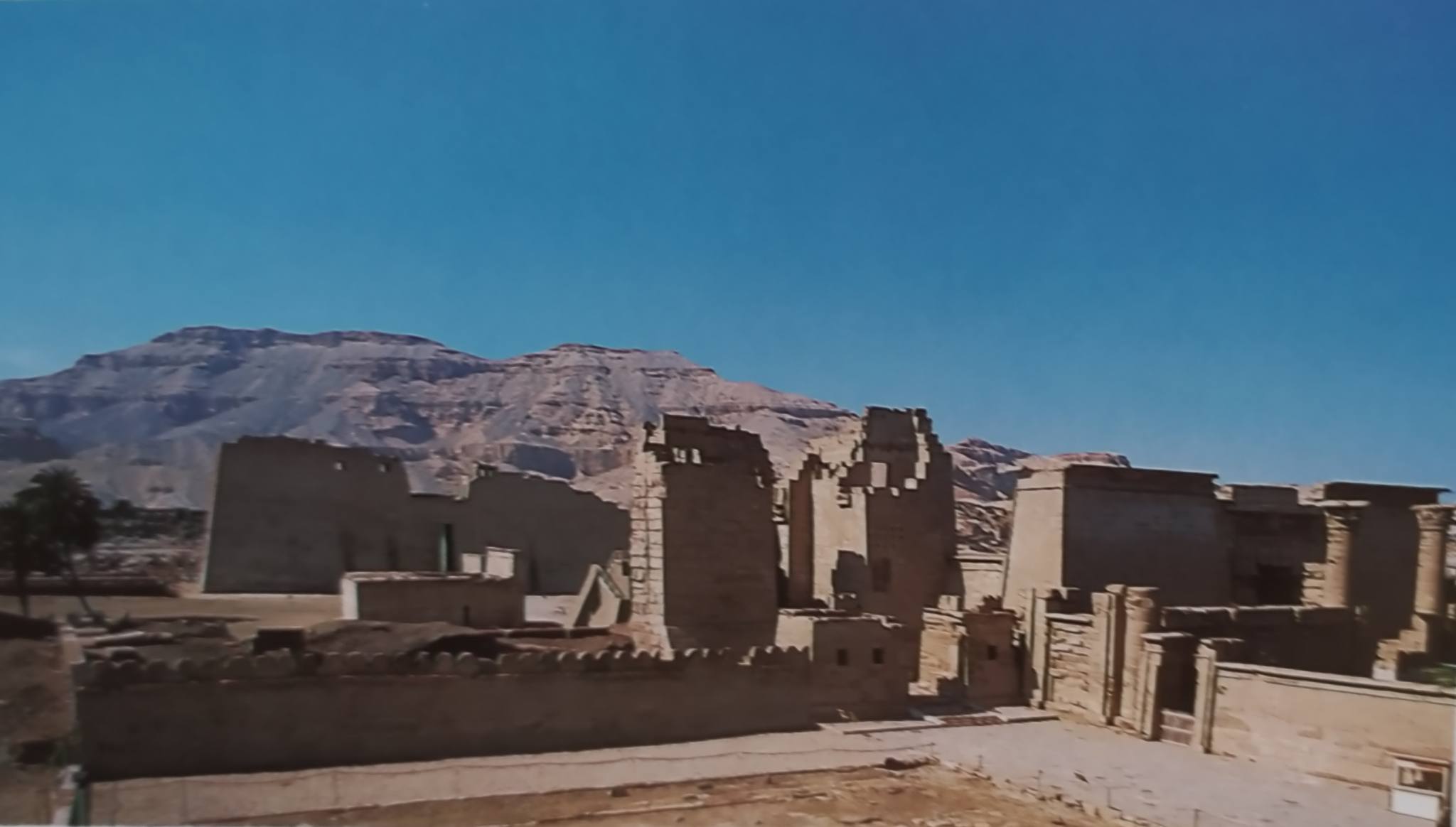 Il tempio di Medamud è ubicato circa sei chilometri a nord di Karnak, sulla medesima sponda del fiume. All’epoca della visita, la zona non era ancora ingombra da edifici moderni, perciò i resti erano facilmente visibili e, naturalmente, attirarono l’attenzione dell’infaticabile artista. Le rovine presenti risalgono all’epoca tolemaica e romana, ma le origini del santuario, dedicato a Montu, sono molto più remote. Nell’antica Madu (è questo il nome originario della località), il culto di questo dio della guerra si instaurò, infatti, già dall’Antico Regno, quando fu eretto un primo tempio, poi ampliato da Sesostri III e successivamente dai sovrani del Nuovo Regno.