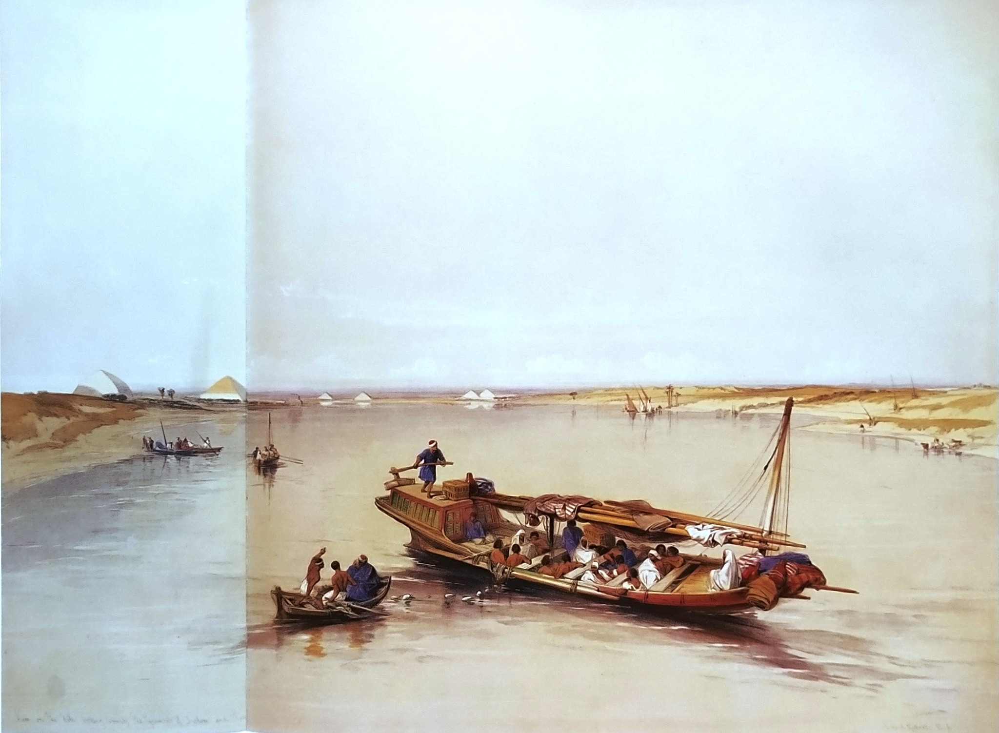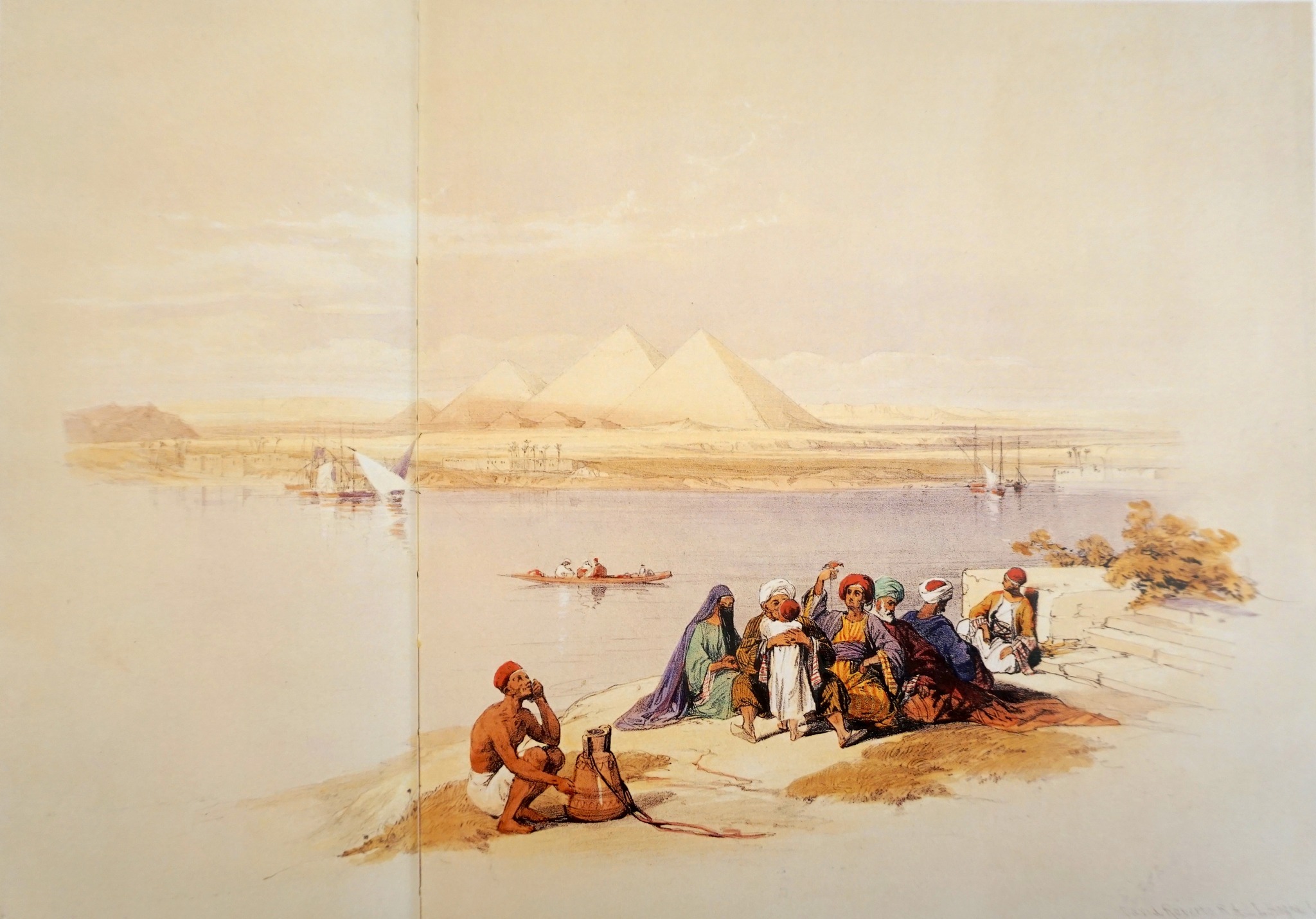 La prima litografia delle piramidi fu disegnata da Roberts dalla riva orientale del Nilo, nei pressi dell’imbarcadero del traghetto per Giza (Immagini n. 1-2)