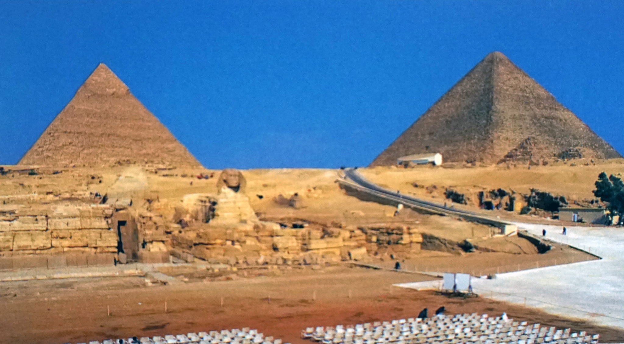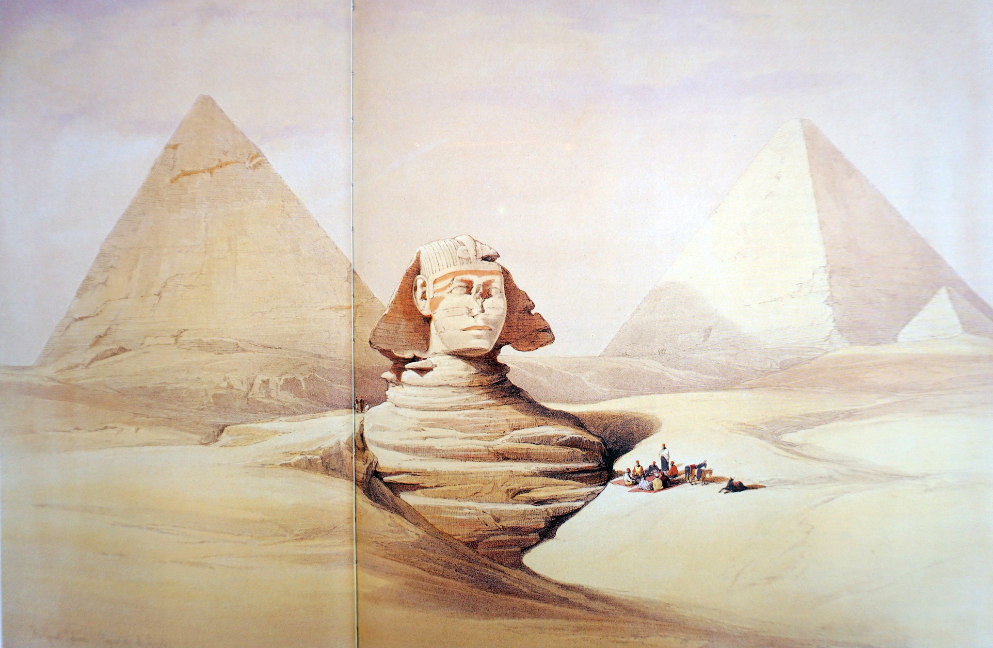 Quando visitò la Sfinge, Roberts, ne vide, emergente dalla sabbia, quasi solo il volto che all’epoca presentava tracce policrome molto più evidenti di quanto non lo siano oggi (Immagini n. 1-2). La titanica scultura fu soggetta già dai tempi antichi all’insabbiamento; ai tempi di Erodoto, ad esempio, doveva essere addirittura del tutto invisibile, dal momento che lo storico non ne fece alcuna menzione.