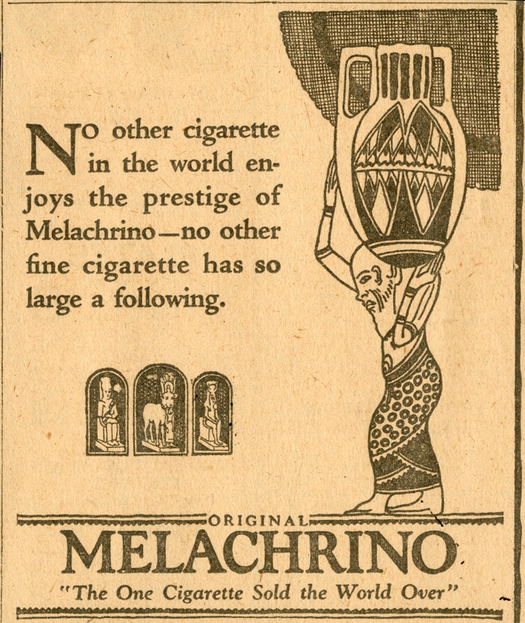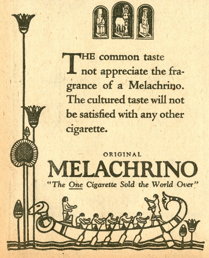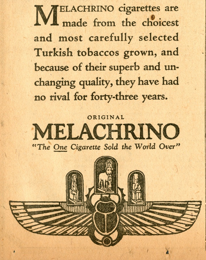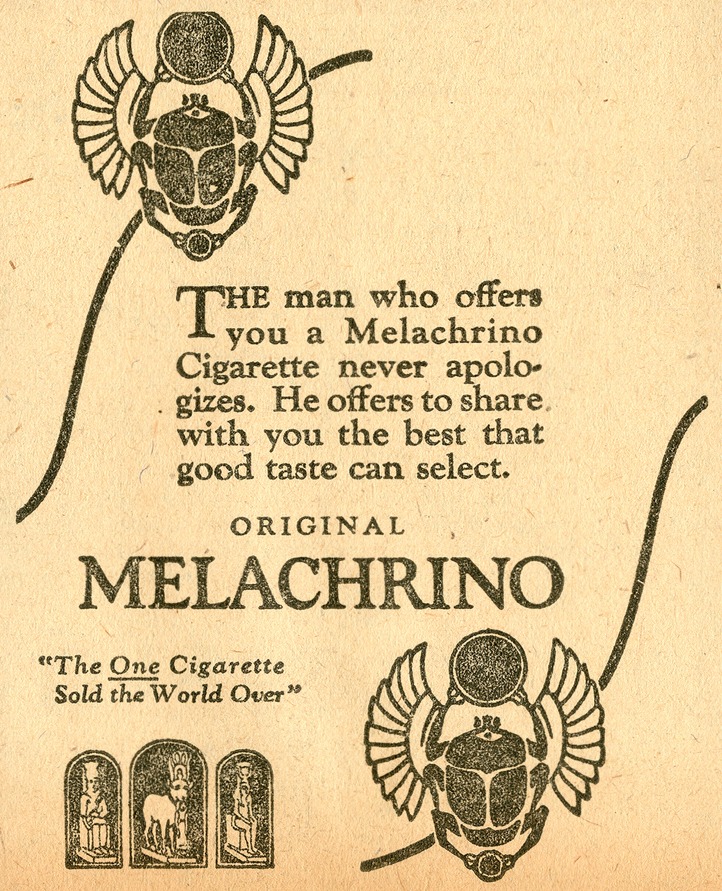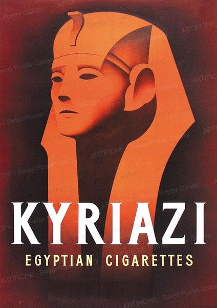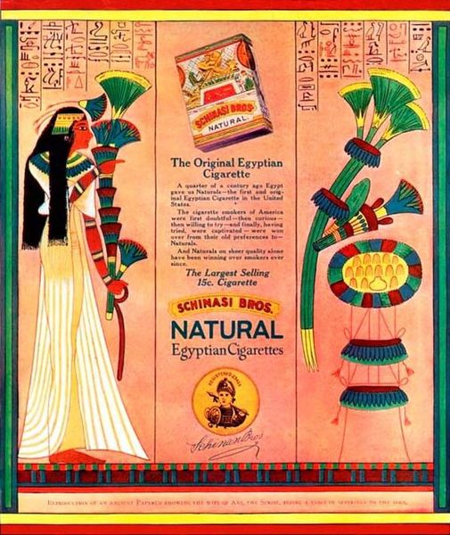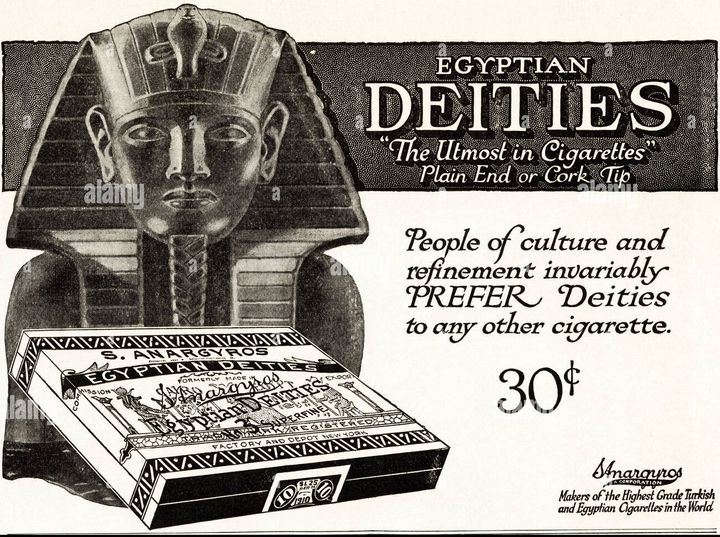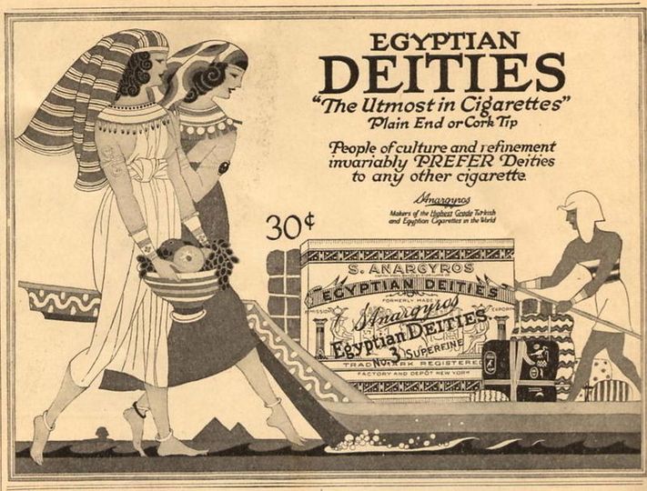Divinitá egiziane, la ditta di tabacchi del greco Sotirios Anargyros, che all’inizio del secolo scorso aveva fondato negli USA questa attivitá commerciale, proponendo anche una campagna visiva ispirata a questa civiltá del passato, ma anche ad altre. Nella fattispecie l’Egitto ricorrreva molto nelle pubblicitá perché l’Egitto, tra 800 e 900, era in auge proprio in questo settore, Spieghiamo.
