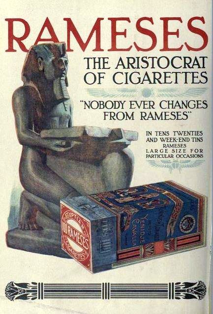 Nel 1895, la Stephano Bros. di Philadelphia introdusse le sigarette Rameses II, che prendevano il nome dal grande faraone dell’antico Egitto. La maggior parte delle pubblicità per Rameses II presentava temi egiziani, dalle immagini di scarabei alle raffigurazioni del vero tempio di Rameses ad Abu Simbel. Altre pubblicità per Rameses raffiguravano vacanze di lusso per commercializzare le grandi “lattine da weekend” ideali per viaggi brevi. Il marchio capitalizzava l’aristocrazia, il glamour e il lusso nella sua pubblicità. Sembra che Rameses sia stato interrotto alla fine degli anni ’90.