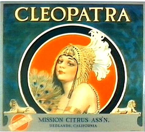 CLEOPATRA, etichettta per cassa di agrumi, produzione dalla Mission Citrus di Redlands, Califonia, 1940 ca.