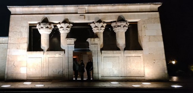 Questo suggestivo tempionon si trova, come verrebbe naturale supporre, in Egitto bensì a Madrid. Siamo nel 1960. La costruzione della Grande Diga di Assuan, minacciava di sommergere i Templi della Bassa Nubia . L’UNESCO, in stretta collaborazione con i governi d’Egitto e Sudan, convocò la comunità internazionale affinché ci si adoperasse per il salvataggio di questo straordinario patrimonio storico e artistico, provvedendo allo smontaggio e alla traslazione in posizione sicura, rispetto all’innalzamento del livello delle acque. Il tempio di Debod, destinato a essere donato ad un Paese straniero per il sostegno al progetto di recupero, fu il primo a essere smantellato e le sue sezioni depositate sull’isola di Elefantina, ad Assuan. Nel 1968, il governo egiziano deliberò la sua donazione alla Spagna, per l’aiuto prestato nel salvataggio dei Templi di Abu Simbel. Due anni dopo, i blocchi furono trasferiti ad Alessandria dove furono imbarcati verso la nuova destinazione. La ricostruzione a Madrid ebbe inizio nel 1970 e nei mesi seguenti si provvide a impiantare giardini e realizzare degli stagni; furono montati i blocchi nubiani e ricostruite fedelmente le parti mancanti. Nel luglio del 1972, il tempio fu aperto al pubblico.