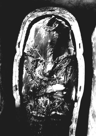 Il volto scoperto, quasi fosse impossibile per le mani che hanno chiuso la bara ricoprire la sua bellezza. Si nota intorno alla testa il secondo drappo avvolto appositamente per non celare il volto
