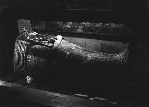 La terza bara nella maestosità del bianco e nero di Burton. In basso spiccano i simboli “shen” ghermiti dagli artigli di Nekhbet e Wadjet. Si notano le due maniglie all’altezza delle spalle