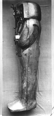 Il fianco sinistro della bara, dove spiccano sull’oro le ali spiegate delle dee e il fianco destro in una foto molto più moderna