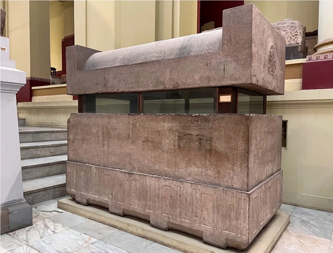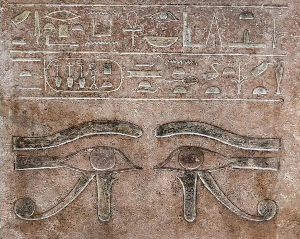 Tra le illustrazioni allegate ai precedenti contributi, c’è un’immagine del sarcofago litico che reca sul fianco destro una brevissima iscrizione geroglifica posta su due righe (Museo Egizio del Cairo). La prima illustrazione ritrae il sarcofago nella sua interezza compreso il coperchio. Il lato presentato è quello destro e si può notare la decorazione in oggetto.
