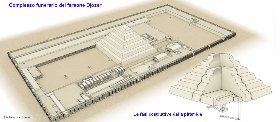 Come località scelse Saqqara ed affidò i lavori al suo più fidato architetto, Imhotep, proveniente da Mendes era figlio dell’architetto di Menfi Kanofer e della giovane Khreduonkh. Si distinse fin dalla giovane età per le sue notevoli capacità intellettuali in quasi tutti i campi cosa che gli valse la nomina a visir sotto il faraone Djoser. Chi meglio di lui avrebbe potuto soddisfare le manie di grandezza del faraone.