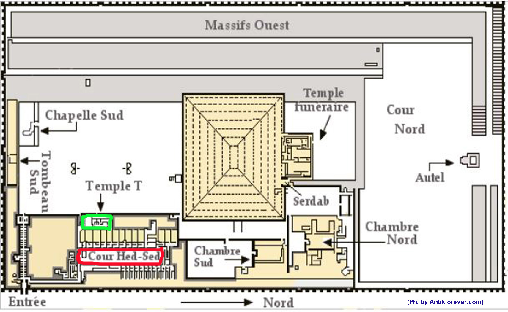 All’interno si trovano sculture complicate dal significato oscuro, tra esse spicca una falsa porta semiaperta, potrebbe rappresentare un passaggio simbolico verso l’aldilà. Il Tempio viene anche comunemente chiamato “Tempio della Heb-Sed” (la Festa Sed), trovandosi in prossimità della corte giubilare, potrebbe essere servito come struttura di culto sacerdotale dove si sarebbero tenuti i riti preparatori alla festa Sed. Anche qui, come nell’intero complesso, la struttura arcaica che si presentava in mattoni crudi la troviamo costruita in pietra.