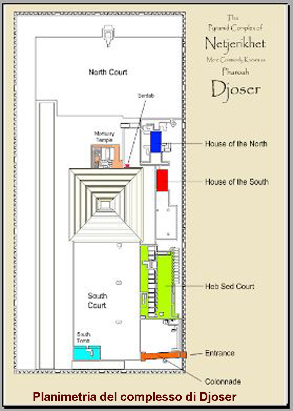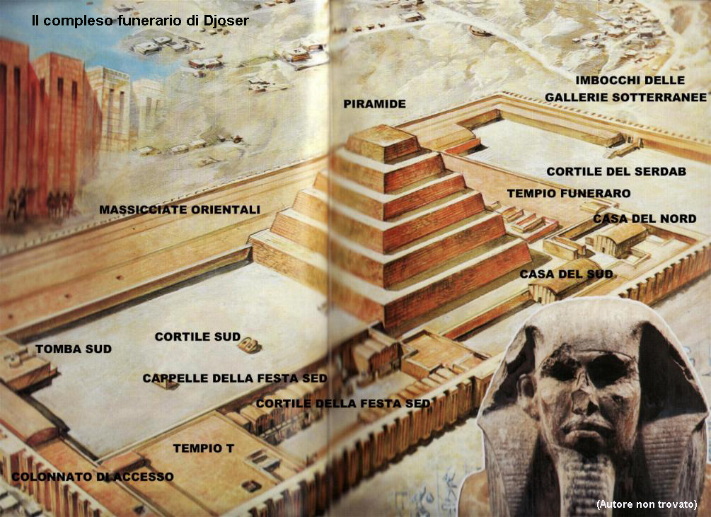 Forte dei progressi che si verificarono durante il suo regno, con l’intento di dimostrare la sua grandezza, Djoser non si accontentò di una semplice mastaba come tomba ma volle qualcosa di molto più grandioso. Chiamò il suo fedele architetto affidandogli il compito di edificare un complesso che potesse incutere ammirazione e timore nel visitatore, straniero e non.