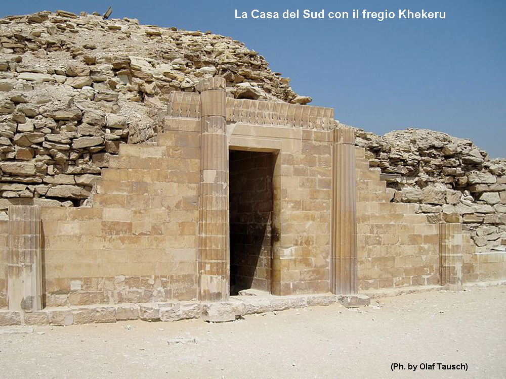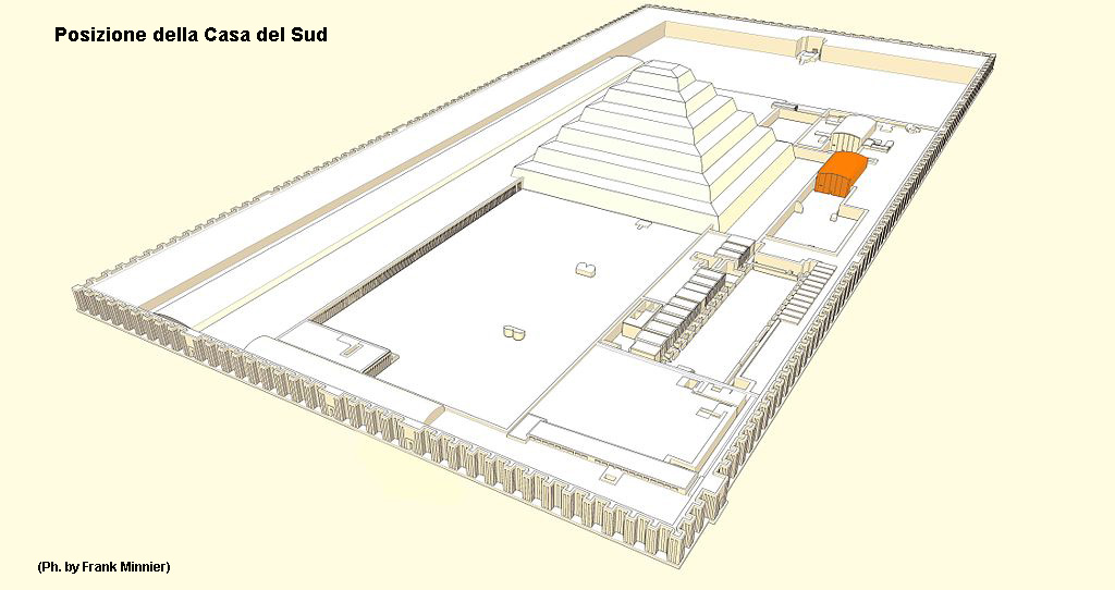 La Casa del Sud, che presentava una serie di capitelli dalla forma di fiore di loto (oggi scomparsi), molto probabilmente simboleggiava la sala del trono dell’Alto Egitto. Con il solito metodo dell’anastilosi, Lauer fece ricostruire la facciata rivolta a sud che risultò ornata da quattro colonne simili a quelle delle cappelle Heb-Sed.