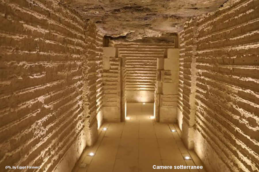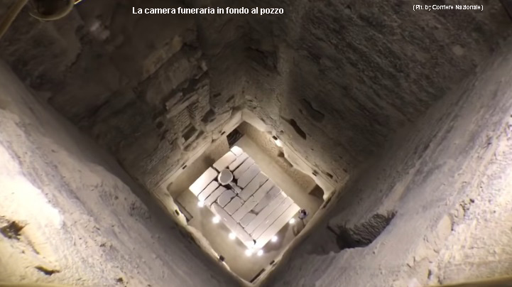 Alla base del pozzo la camera funeraria, in granito rosa, si presenta quasi uguale a quella sotto la piramide e anch’essa possiede la “camera di manovra”, il tutto di dimensioni leggermente ridotte.