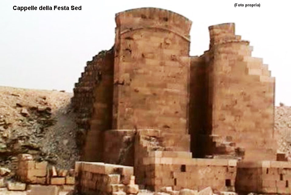 Torniamo al cortile della Festa Sed, esso consiste in un ampio spazio rettangolare di 198 x 187 metri che si trova sempre ad est del complesso. Sul lato orientale si trovavano dodici cappelle con coronamento arcuato incorniciate da un astragalo liscio (modanatura detta anche tondino).