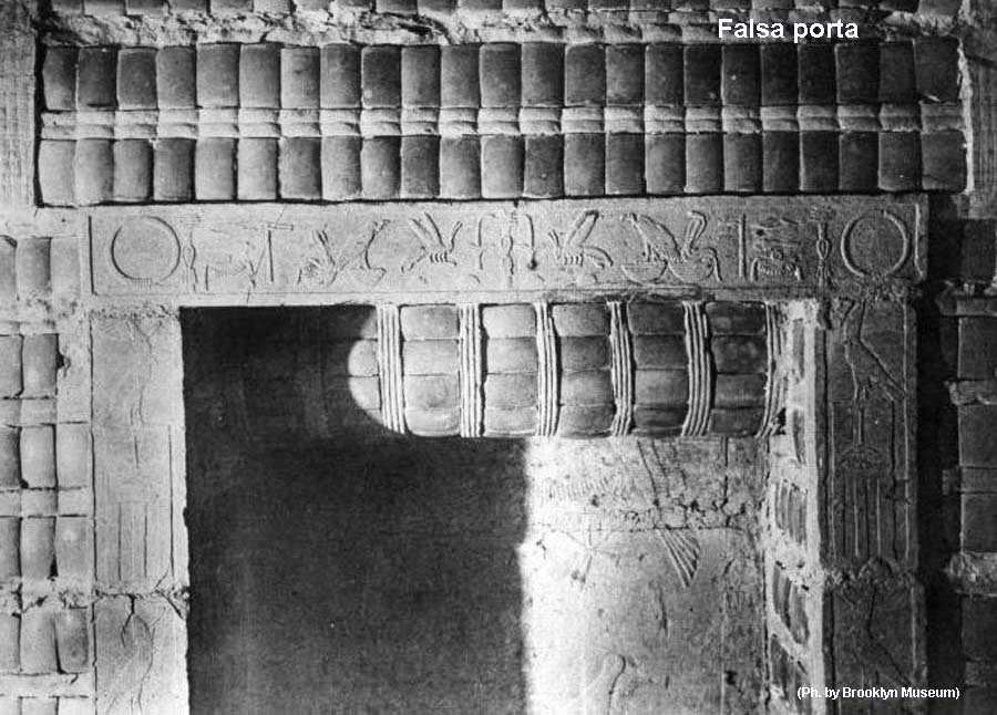 In altre due camere sono presenti tre “false porte” nella cui cornice compare il serekht con l’antica titolatura reale in geroglifici oltre a bassorilievi dove il sovrano è rappresentato mentre officia riti sacri.