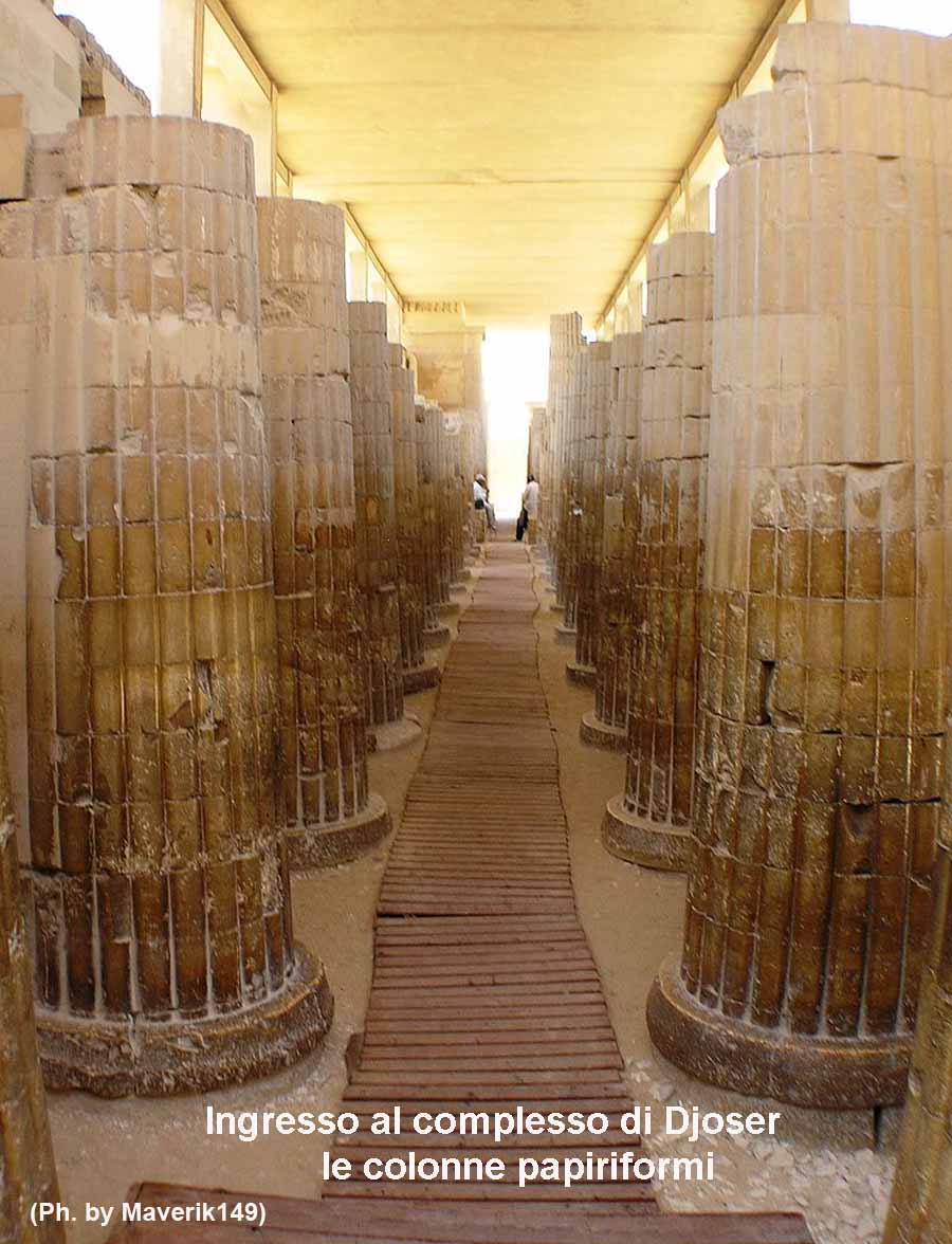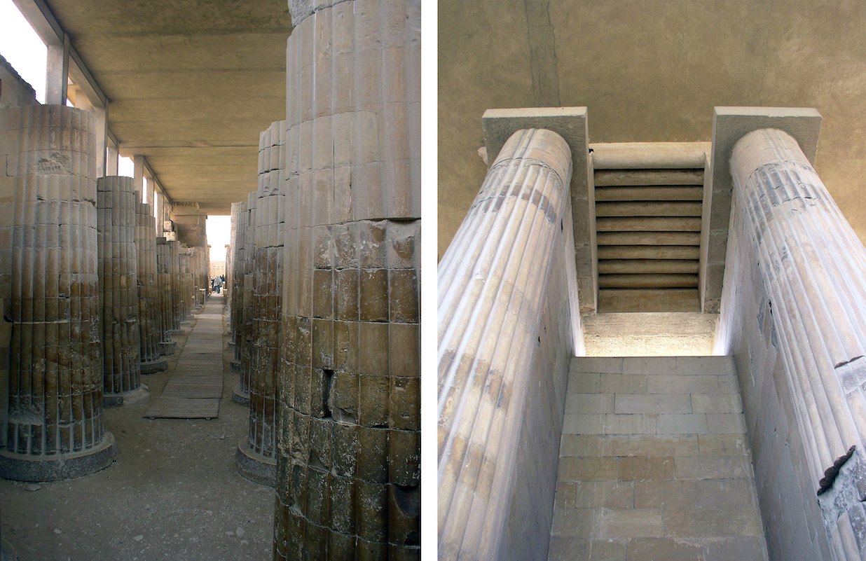 Il corridoio d’ingresso al complesso funerario di Djoser, con colonne di sei metri, ed uno dei colonnati interni, con tetto in travi di pietra (foto Amy Calvert). Inizialmente erano probabilmente dipinte in verde, a simboleggiare fasci di canne che emergono dalle paludi della Creazione. Questo elemento architettonico, così caro alla civiltà egizia, fu introdotto proprio da Imhotep.