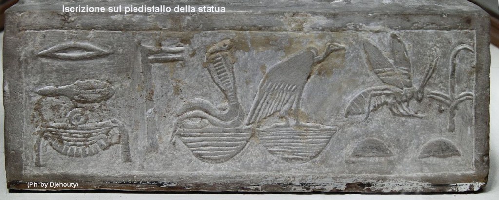 La parte anteriore della base reca incisi in bassorilievo i titoli e il nome del sovrano, che è Netjerket.