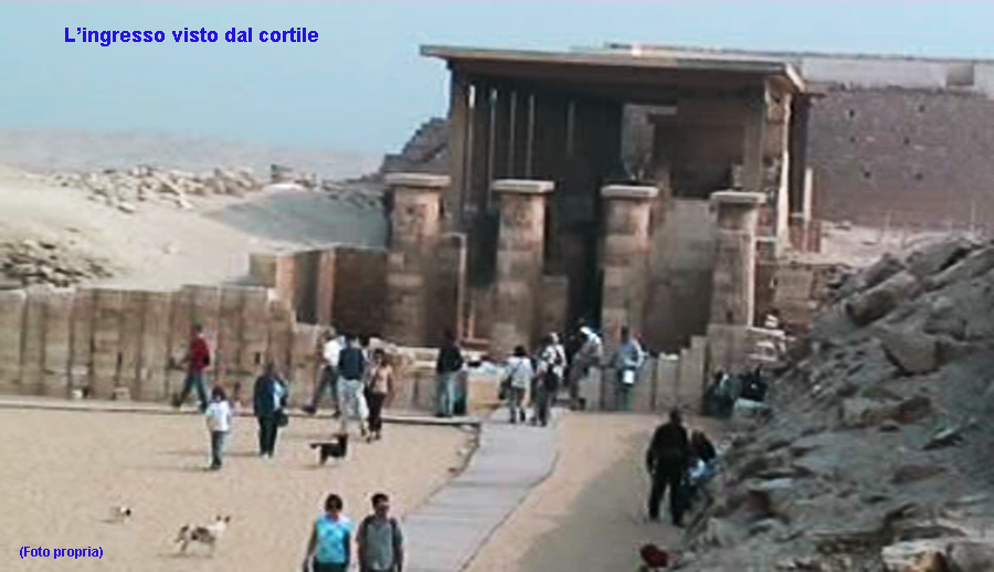 L’ingresso si presenta spostato rispetto al centro di due colonne che ornano la facciata, al di sopra di esso compare un fregio continuo con il geroglifico “Khekeru” ad imitazione dei tetti di stuoie intrecciate che ornavano gli edifici di epoca predinastica adibiti al culto della dea avvoltoio Nekhbet di Ieracompoli.