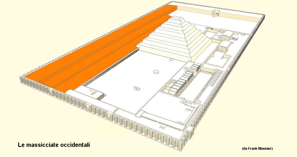 Ora passiamo al lato occidentale del complesso dove si estendono tre lunghi edifici affiancati di lunghezze diverse allineati nord-sud, il più occidentale era lungo circa 400 metri, largo 25 e alto 5 metri. Gli altri due sono via via più bassi ed il terzo addirittura si appoggia per qualche metro direttamente sulla piramide.