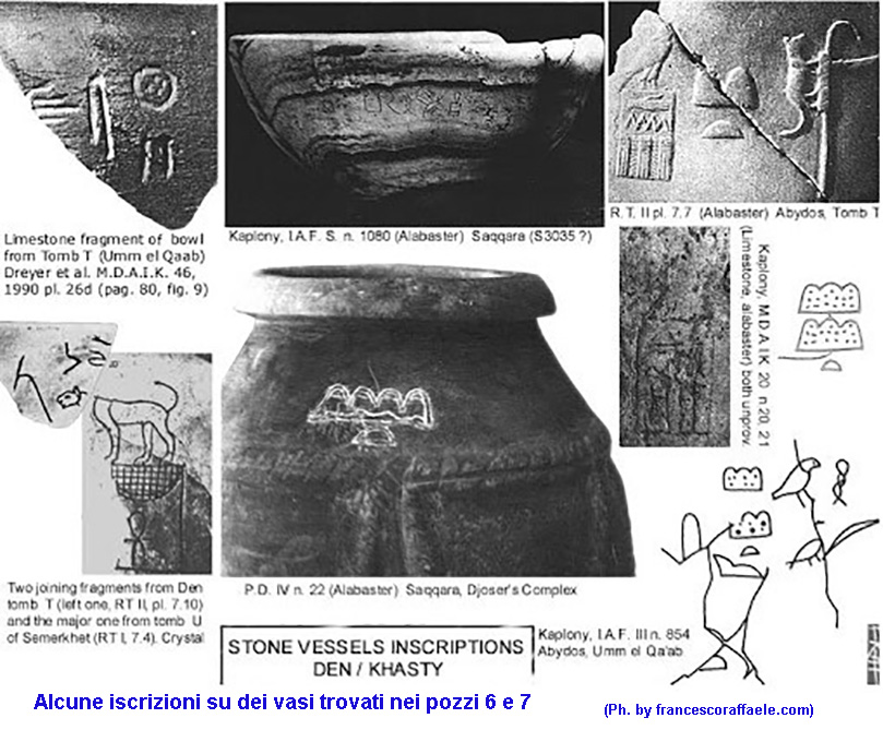 Ma la sorpresa più grande fu quella che riservarono il sesto ed il settimo pozzo dove erano contenuti numerosi piatti, tazze e circa 40.000 vasi dalle forme e dimensioni più disparate ricavati da vari materiali, alabastro, onice, scisto, porfido, quarzo, serpentino e breccia. Fra essi numerosi vasi identici a quelli trovati da Flinders Petrie nel villaggio di Naqada, ancora nessuno, oggi è in grado di dare spiegazioni.