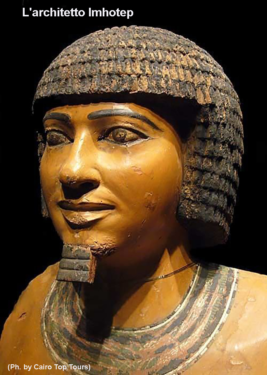 Fu Visir del Faraone e ricordato come l’architetto della sua piramide a gradoni (all’epoca la più grande struttura umana e tuttora il più antico edificio in pietra sopravvissuto) e dei primi colonnati della storia nel cortile della piramide stessa, ma anche Primo Sacerdote di Ptah (“Figlio di Ptah”), poeta, scrittore, astronomo (risale a lui il calendario di 365 giorni con l’aggiunta di 5 giorni epagomeni), mago ed ovviamente medico. Il papiro Edwin Smith lo ricorda come “il fondatore della medicina”.
