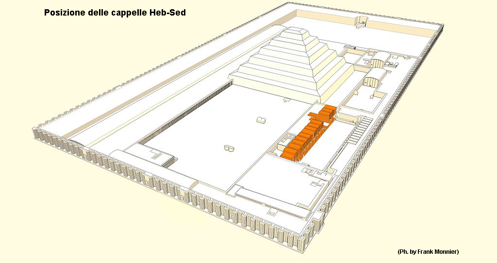 Sul lato occidentale del cortile si trovavano tredici cappelle di due diversi tipi. Un tipo detto “sekh netjer” (sala del dio) con facciata e astragali laterali, il secondo tipo detto “per uer” (grande casa) che rappresentava il santuario dell’Alto Egitto anch’esso anticamente costruito in legno e stuoie.