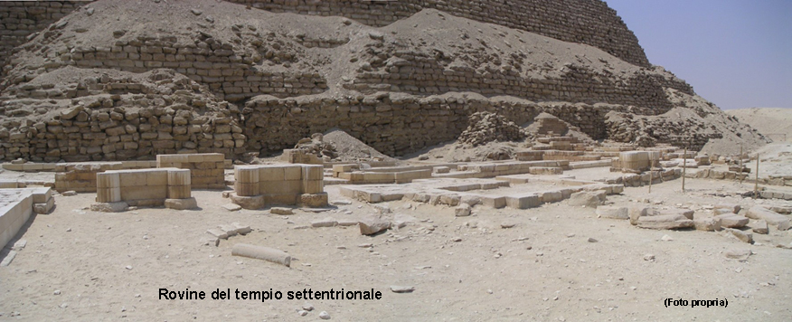 Ovviamente trovandoci sul lato nord non possiamo non dare un’occhiata al Tempio funerario, detto anche “Tempio settentrionale” o nord, per il culto del faraone che si trova proprio alla base della piramide un poco più alto rispetto agli edifici vicini. Orientato in senso est-ovest permetteva l’ingresso attraverso un portico a doppio colonnato al cui interno si trovava la statua del sovrano ed alcune false porte. Allo stato attuale non è ancora stata avanzata un’ipotesi certa del significato delle varie componenti del tempio e la cosa è ritenuta di difficile interpretazione a causa della confusione degli ambienti, corridoi e cortili, che non è riscontrata in costruzioni simili di epoca precedente ne successiva, e con camere doppie chiamate da Lauer “Sale delle abluzioni” per la presenza di un lavacro rotondo sistemato tra le sale.