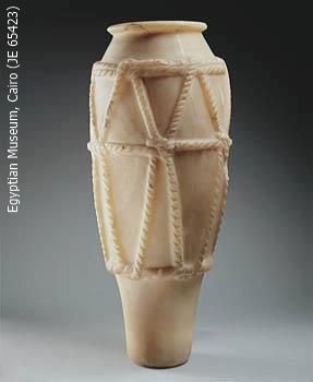 Il grande vaso in alabastro raffigurato qui sopra (H. 63.5 cm, diam. 19.1 cm), oggi al Museo del Cairo (JE 65423) mostra l’elevato livello di abilità raggiunto dagli artigiani della 3a dinastia nella lavorazione della pietra, pur con strumenti modesti; esso è decorato con un motivo geometrico che imita in modo molto realistico l’imbragatura di corda che veniva effettivamente utilizzata per trasportare oggetti pesanti.