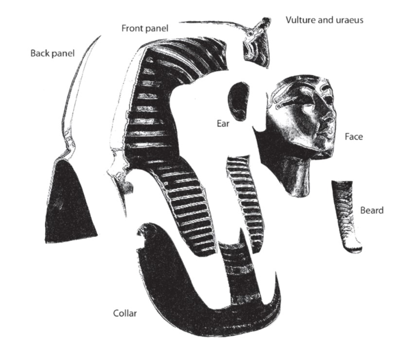 Innanzitutto sappiamo che la maschera, che pesa ben 11 chilogrammi d’oro, non è formata da un unico pezzo: La maschera infatti è formata da almeno otto parti diverse, unite da rivetti, in due leghe diverse d’oro, entrambe ad alta caratura (parliamo di > 23 carati per la “base” e 18-23 carati per le finiture), leggermente più fredda per viso e collo, più calda per il resto della maschera.