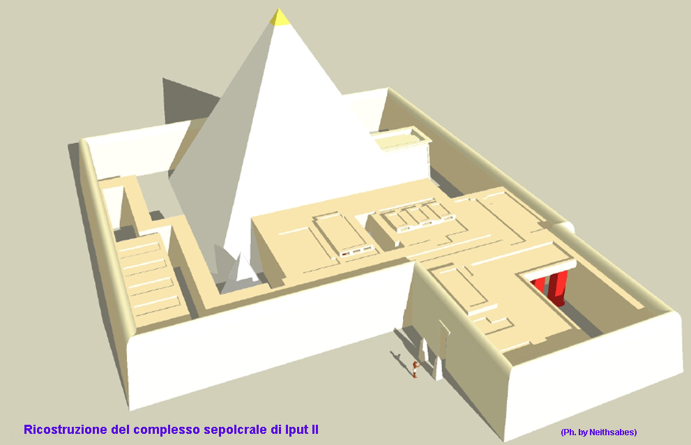 Durante la VI dinastia tutte le spose reali, anche se i loro figli non diventarono mai faraoni, ottennero una piramide per tomba con il proprio tempio sulle pareti del quale spiccavano i nomi ed i titoli della regina. Il complesso funerario di Iput II, che doveva ricalcare quella di Neith, comprendeva una piramide ed un Tempio sepolcrale annesso, eretto su un pozzo a forma di L nei pressi della piramide di Pepi II. Si accedeva attraverso una porta in granito rosa con ai lati due obelischi sempre di granito rosa sui quali erano riportati il nome e i titoli della regina.