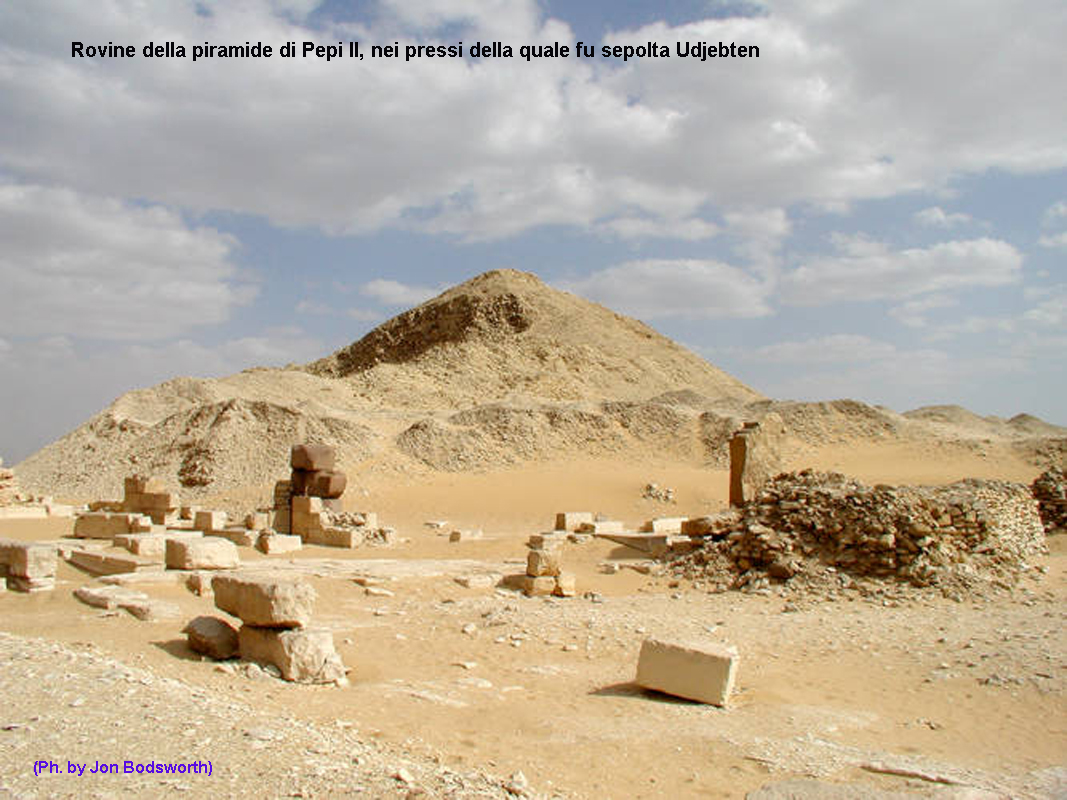 La terza moglie, per la quale Pepi II fece costruire un complesso funerario, fu la regina Udjebten la quale sicuramente rivestì un ruolo meno importante di altre, infatti gli venne riservato un complesso un po’ più piccolo dotato comunque di una piramide, un tempio funerario ed una piccola piramide cultuale.