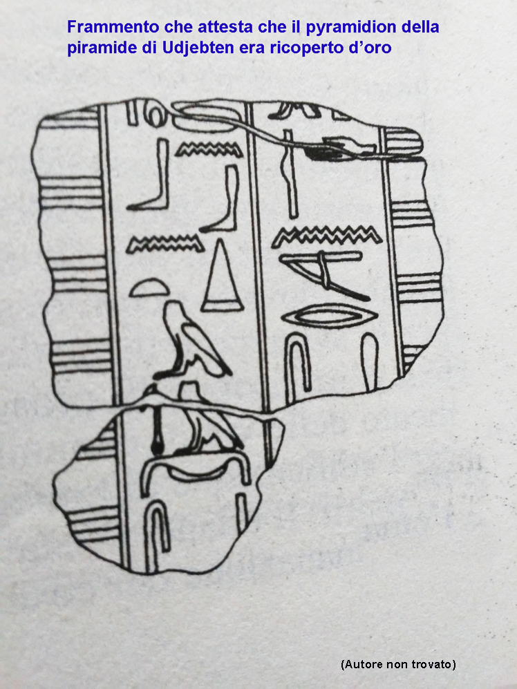 Tra le cose trovate c’era un enorme blocco di basalto che faceva parte della saracinesca di sbarramento. Ancorché neppure Udjebten vantasse il titolo di “Regina madre”, durante gli scavi Jéquier scoprì un frammento dell’iscrizione di un decreto che tutelava il culto della regina. Dai miseri resti della camera funeraria è emerso che le pareti erano ricoperte con i testi delle piramidi di cui sono rimasti 84 frammenti