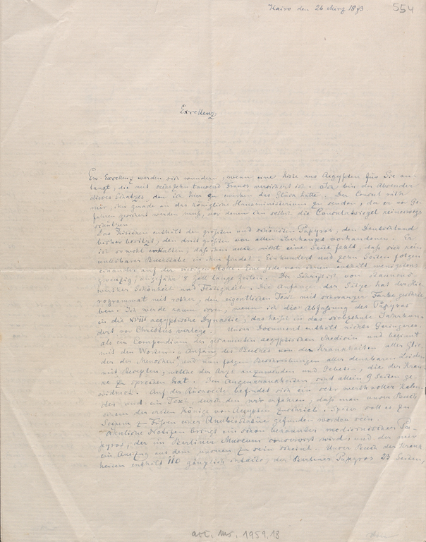 “Sua Eccellenza rimarrà stupita del contenuto della cassetta che ho inviato dall’Egitto, assicurata per 17,000 franchi…La scatoletta contiene il papiro più grande e più bello che la Germania possieda, il terzo più grande di tutti quelli esistenti. È così completamente conservato che non manca una pagina, che non vi si trova una lettera illeggibile. Centodieci pagine si susseguono…di sorprendente bellezza e coerenza. Il nostro documento contiene nientemeno che un compendio di medicina egizia ed inizia con le parole: ‘Inizio dl libro delle malattie di tutte le parti dell’uomo’ seguito da tutti i possibili dolori con le relative prescrizioni”