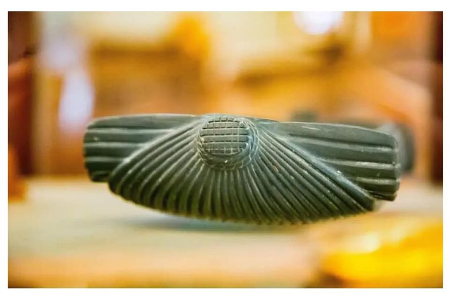 È formato da due parti che, al momento della scoperta, erano ancora unite tra loro per mezzo di un intreccio di fili d’oro e crine, forse di coda di giraffa.