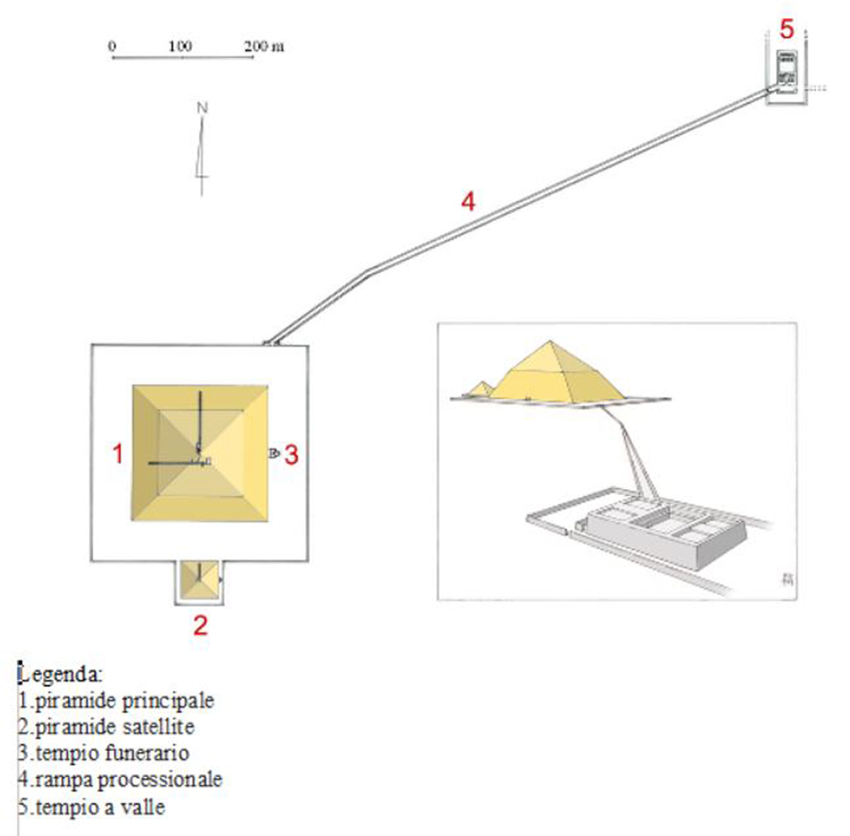 Si pensa che in origine l’intero complesso funerario fosse circondato da un imponente muro di calcare giallo grigiastro, al suo interno un’ampia corte, di pianta quadrata dove nel lato nord-est terminava la rampa cerimoniale.