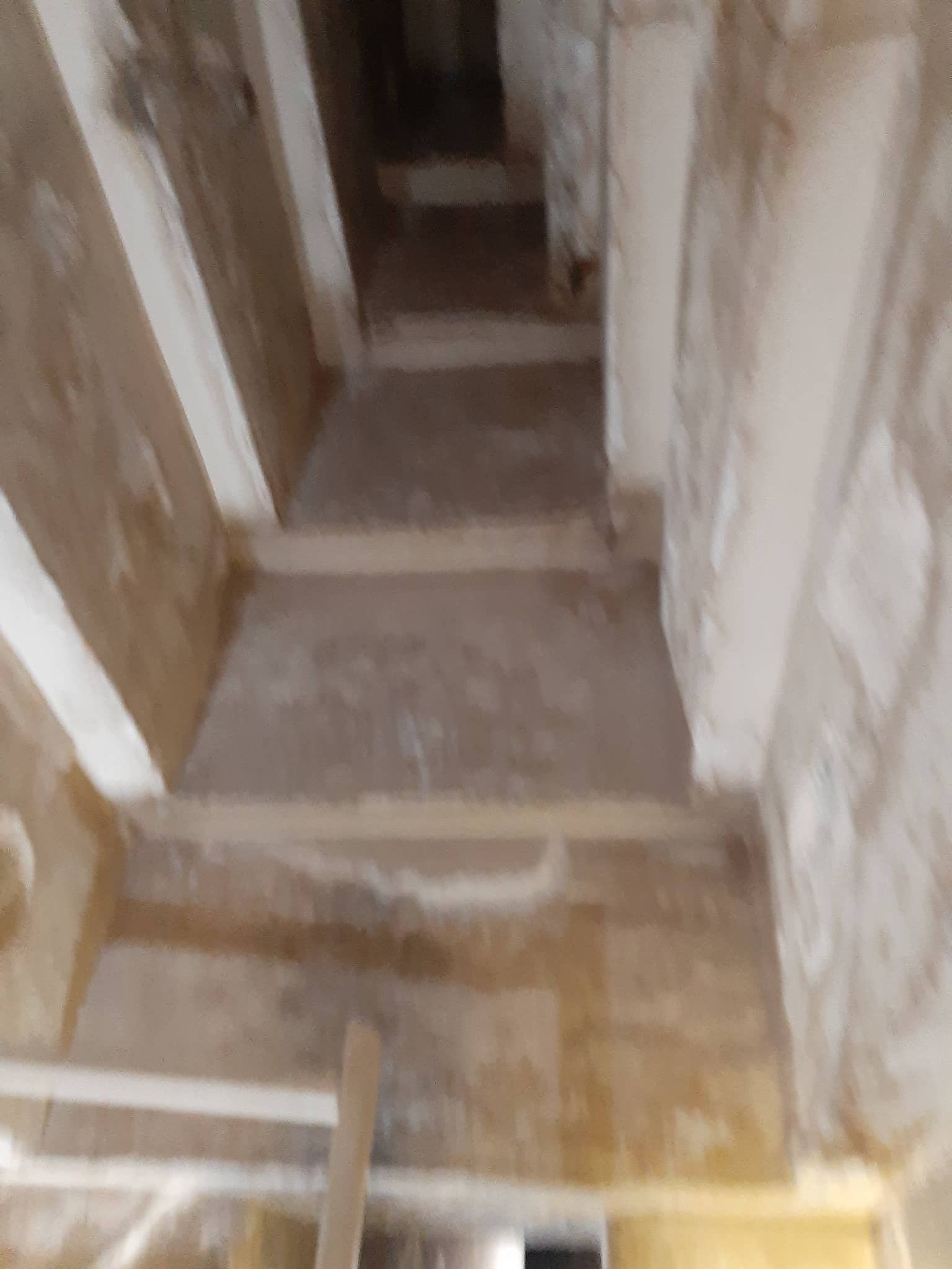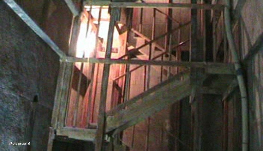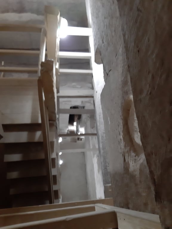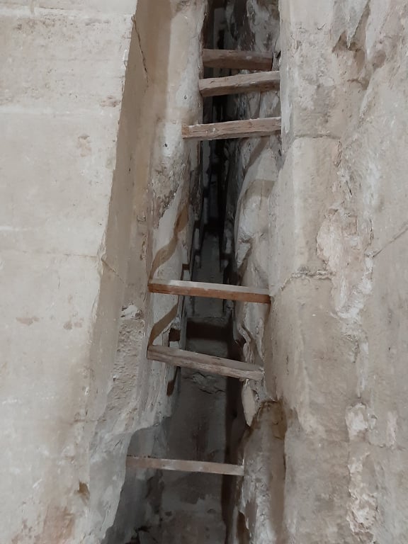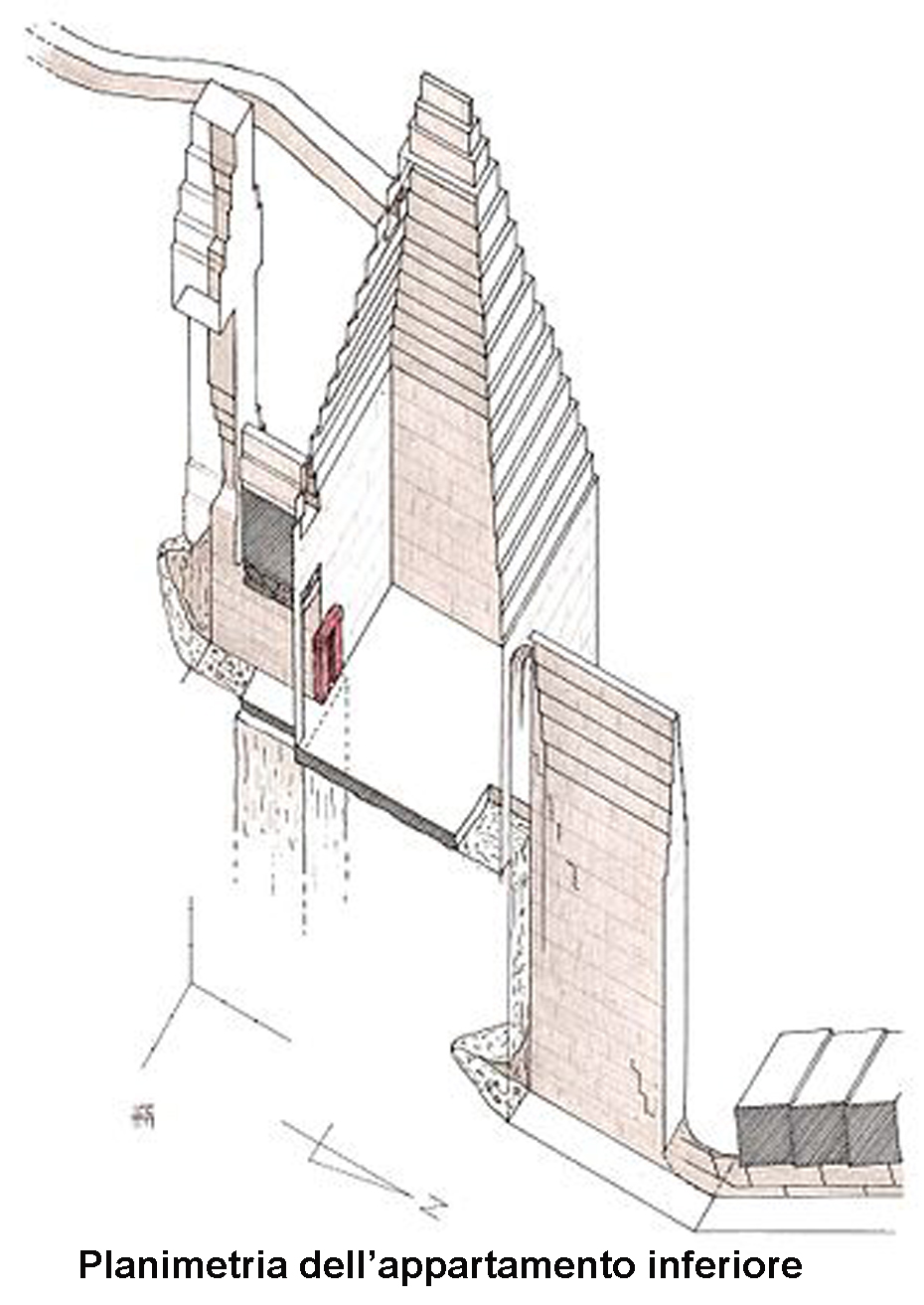 Anche in questa camera si possono notare alcune crepe stuccate con malta gessosa. Lungo le pareti est e ovest si presentano i resti di una stretta scalinata che, in origine, permettevano l’accesso alla camera inferiore.