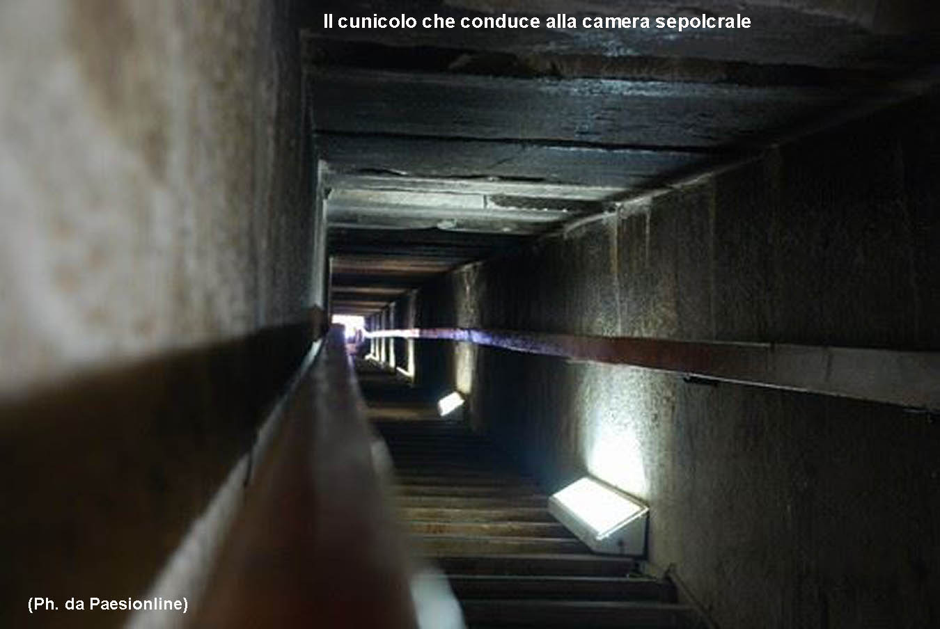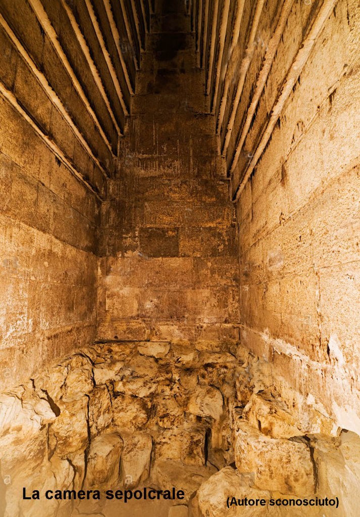 In questa camera che, come tutto il resto dell’appartamento funerario sin qui visto si trova inserita nel corpo della piramide, troviamo a 7,80 metri dal pavimento un cunicolo di 7,50 metri che dà accesso alla camera funeraria le cui dimensioni risultano leggermente inferiori a quelle delle anticamere, questa misura 8,30 x 3,60 metri, sempre con volta ad aggetto alta 15,25 metri.