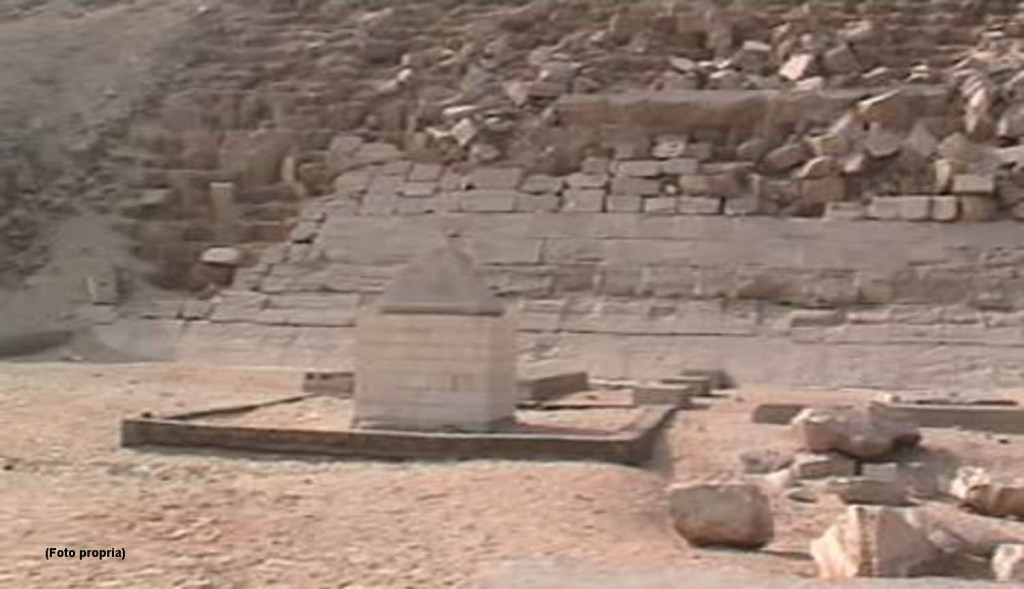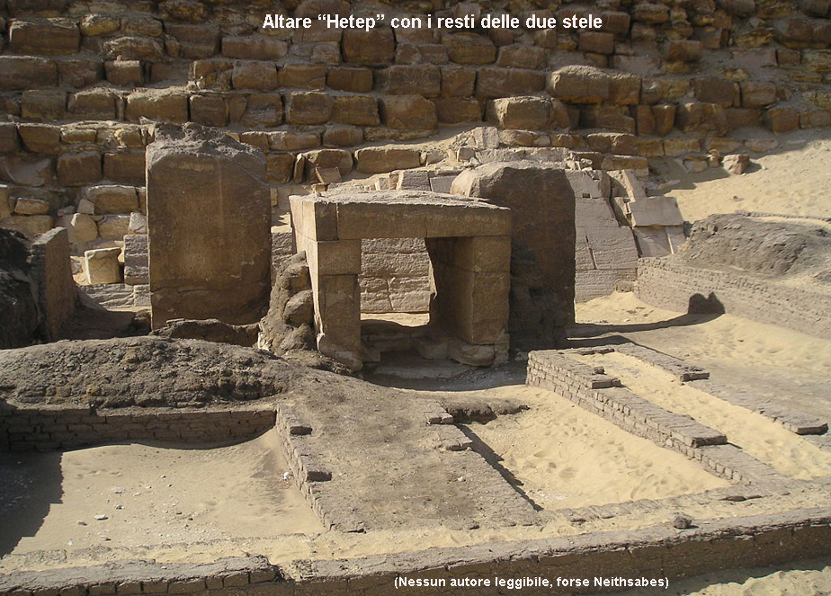 Un secondo luogo per sacrifici all’aperto era situato lungo l’asse est-ovest ad oriente della piramide, consisteva in un altare costituito da tre blocchi in calcare e comprendeva due enormi stele monolitiche sempre in calcare dalla forma di “hetep” alte circa 9 metri poggianti su un basamento, oggi raggiungono solo più i 2 metri circa.