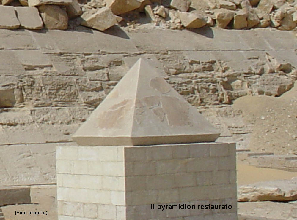 Personalmente mi chiedo: se Snefru ha completato la piramide di Maidum e poi ha costruito quella romboidale, come è possibile che abbia iniziato a costruire quella rossa durante il terzo anno di regno? Se si presume che per costruire quest’ultima abbia impiegato da 10 a 17 anni, la altre due le ha costruite in 3 anni? Nelle mie ricerche non ho trovato nulla che mi spieghi questo paradosso. Nei pressi della piramide vennero rinvenuti i resti di un pyramidion in calcare, oggi restaurato che fa bella mostra di se davanti alla piramide, un ritrovamento del genere è il più antico fino ad oggi. Non è però certo che questo pyramidion sia stato realmente impiegato per la piramide Rossa in quanto il suo angolo di inclinazione è diverso da quello della piramide.