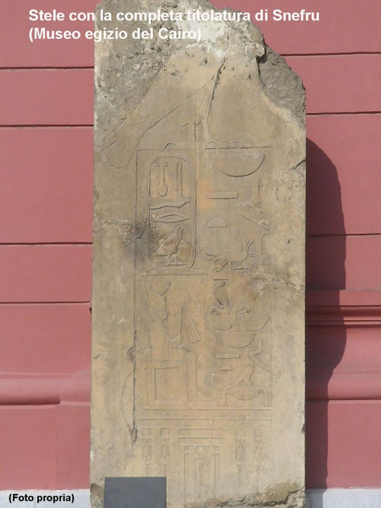 Va precisato che durante il regno del faraone Snefru compare, per la prima volta, il cartiglio, ovvero l’ovale che racchiude il “praenomen” del sovrano “nesut-biti”. Il cartiglio è simile ad un altro trovato in un’iscrizione al Wadi Maghara.