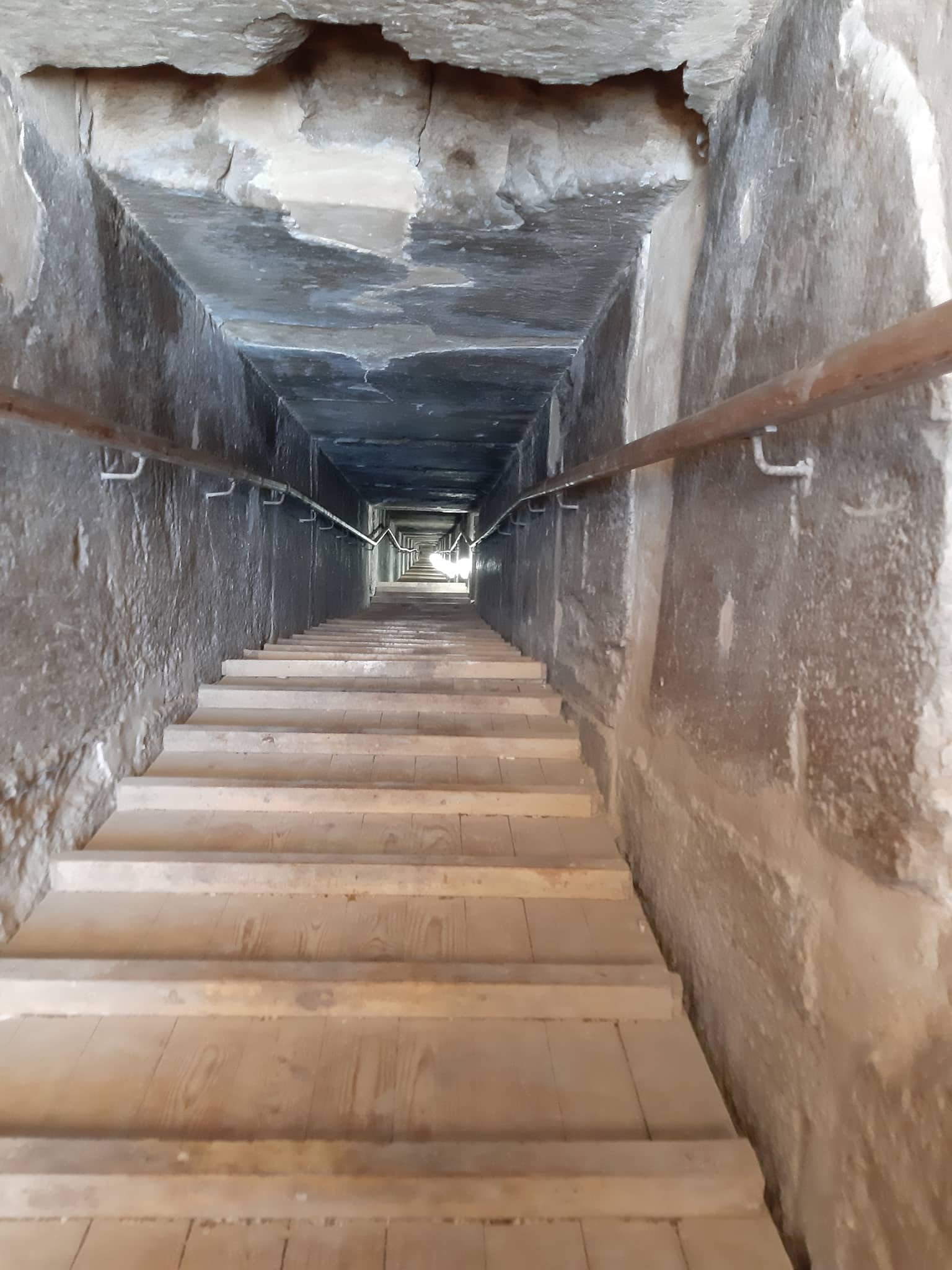 L’ingresso della piramide lo troviamo nella parete nord ma per raggiungerlo dobbiamo salire ad un’altezza di 28,65 metri dalla base; ci infiliamo e scendiamo attraverso un corridoio discendente di 58,80 metri e ci troviamo al livello della base della piramide.